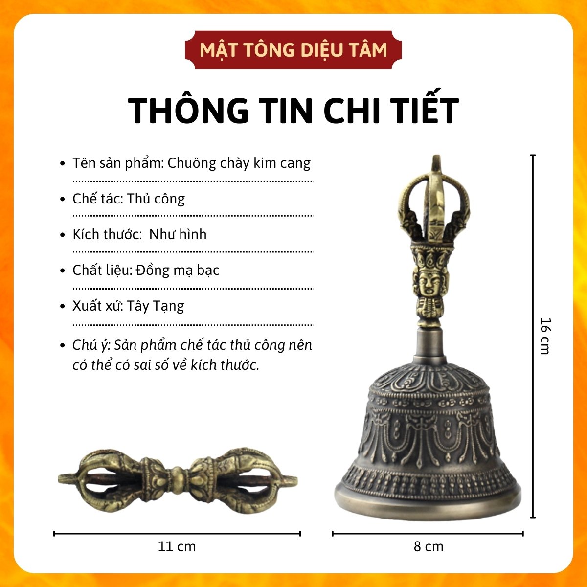Mua tại TiktokChuông chày kim cang - Linh đồng - chuông lắc - chuông tay - pháp khí mật tông bằng đồng tráng bạc cỡ lớn MS1K Diệu Tâm Thông tin chi tiết: Bộ sản phẩm bao gồm chuông và chày kim cang được khắc tinh xảo, sắc nét Chất liệu: Đồng mạ bạc cao cấp Kích thước: Chuông kim cang 8cm x16cm, Chày kim cang dài 11cm