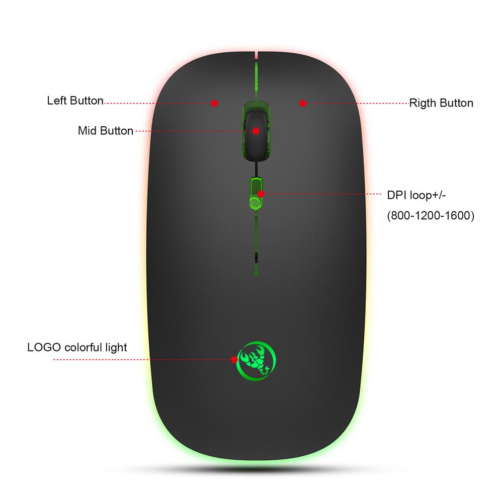 Features: Dual modeconnection, with BT5.1connection and2.4 G wirelessconnection. Rechargeable mouse, built-in rechargeable lithium battery, long endurance time, no need to worry about power shortage. Three-speed sensitivity adjustment, 800/1200/1600 DPI suitable for different use. Colorful luminous