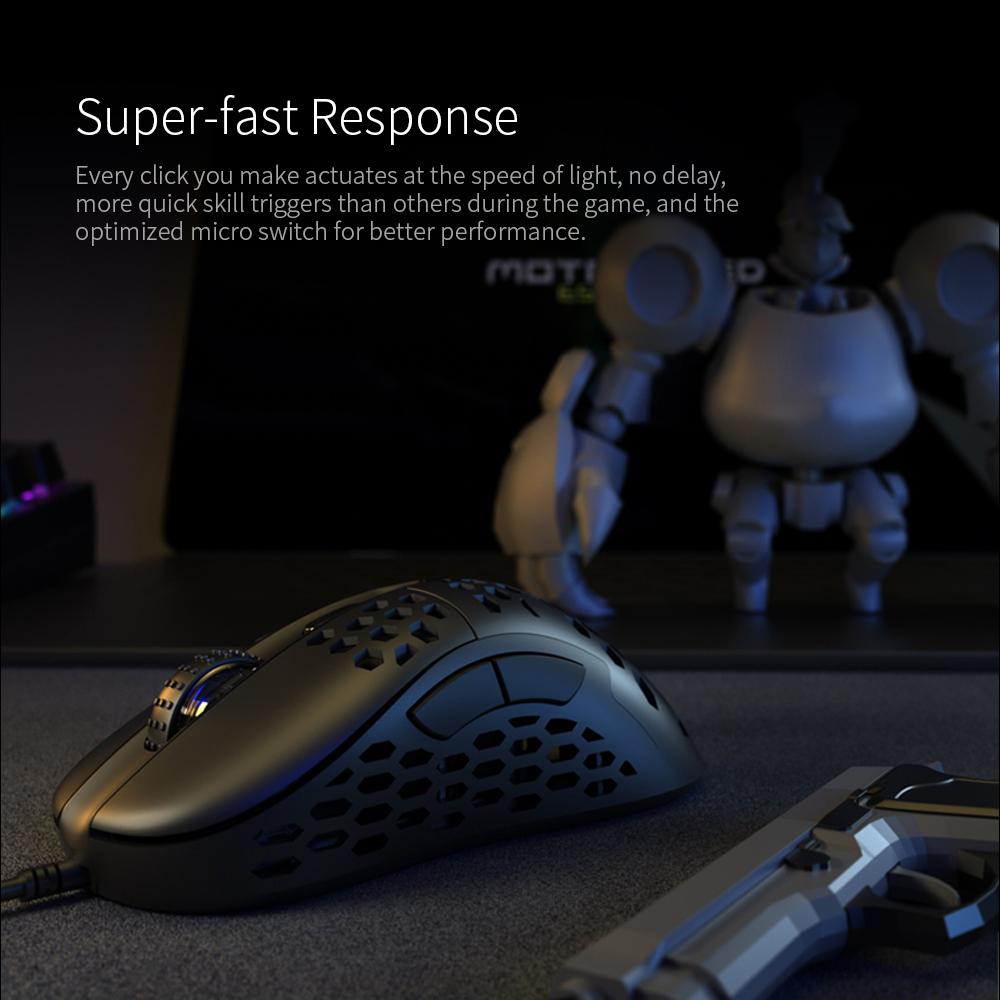 Darmoshark N1 light gaming mouse adopts the honeycomb holes design, with no impacts on its structure strength, for better heat dissipation, easy and smooth game playing.