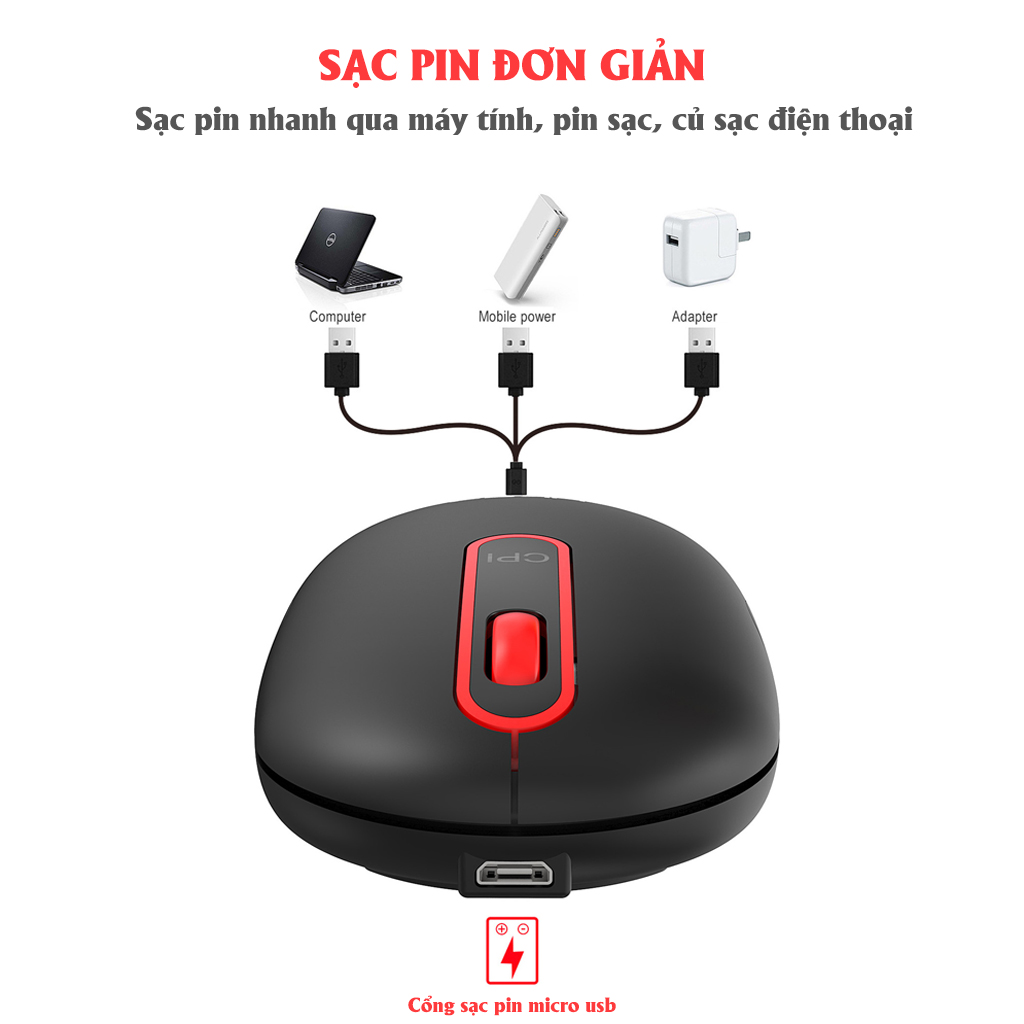 - DPI (độ nhạy): 2400dpi - Dung lượng pin: pin sạc 500mAH giúp bạn thoải mái sử dụng mà không lo hết pin. - Kết nối không dây 2.4G đáng tin cậy và chuột có
