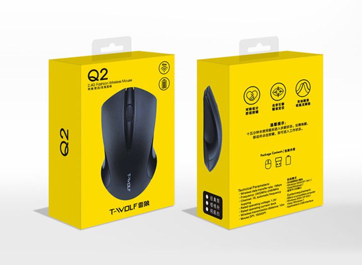 Chuột T-Wolf Q2 có thiết kế đơn giản với hai nút bấm chính và một bánh xe cuộn, phù hợp với các công việc văn phòng cơ bản. Ngoài ra, chuột này còn được trang bị công nghệ tiết kiệm năng lượng, giúp kéo dài thời gian sử dụng pin.