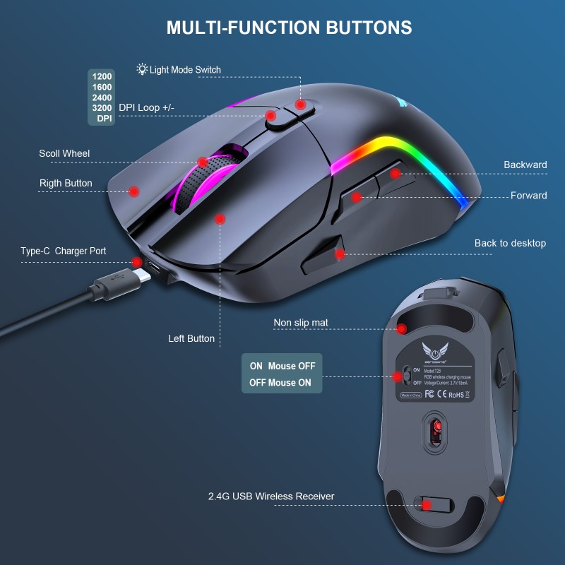 . Chuột Led Không Dây Pin sạc T28 Cổng sạc TypeC chống mỏi cổ tay cho máy tính laptop