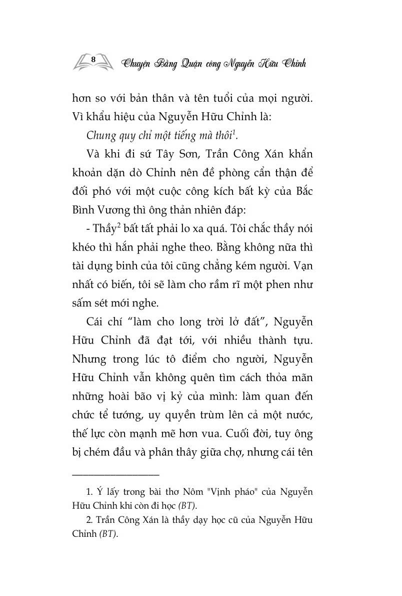Chuyện Bằng Quận công Nguyễn Hữu Chỉnh là một trong những tiểu thuyết lịch sử nổi tiếng của Phan Trần Chúc viết về Bằng Quận công Nguyễn Hữu Chỉnh - nhân vật lịch sử tiêu biểu ở thế kỷ XVIII và giai đoạn lịch sử đầy biến động thời Hậu Lê. Sách đã được Nhà xuất bản Mai Lĩnh - Hà Nội xuất bản lần đầu năm 1943 với tên là Bằng Quận công Nguyễn Hữu Chỉnh. Nhiều sử gia đánh giá Nguyễn Hữu Chỉnh là người có tài ứng biến, xoay chuyển cục diện lịch sử. Với mưu lược và khả năng điều binh, khiển tướng, ông đã hiến kế giúp quân Tây Sơn đánh Chúa Trịnh, lập công lớn phò tá Nguyễn Huệ đánh chiếm Phú Xuân rồi tiến ra Bắc diệt Trịnh, tạo ra thế cục mới. Dẹp xong thế lực họ Trịnh, ông còn thiết kế nên cuộc hôn nhân chính trị của Nguyễn Huệ và Công chúa Ngọc Hân, con gái của vua Lê Hiển Tông. Tuy nhiên, chính vì tự mãn, chủ quan, ông đã trở thành bại tướng trong cuộc đấu trí và đấu lực với anh em nhà Tây Sơn, đồng thời góp phần đẩy nhà Lê lâm vào tình cảnh bi đát. Nhằm đáp ứng nhu cầu tìm hiểu về lịch sử dân tộc, đặc biệt là những nhân vật lịch sử có nhiều dấu ấn trong sử sách, Nhà xuất bản Chính trị quốc gia Sự thật xuất bản cuốn sách Chuyện Bằng Quận công Nguyễn Hữu Chỉnh của tác giả Phan Trần Chúc.