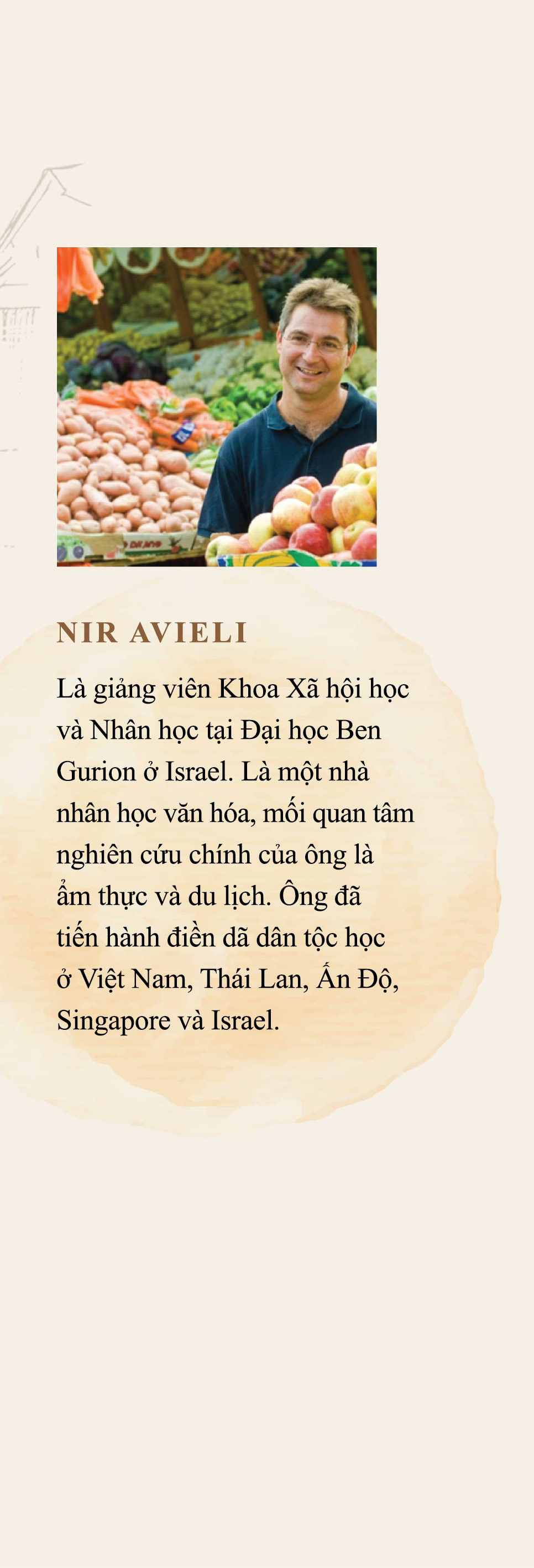 Nir Avieli là giảng viên Khoa Xã hội học và Nhân học tại Đại học Ben Gurion ở Israel. Là một nhà nhân học văn hóa, mối quan tâm nghiên cứu chính của ông là âm thực và du lịch.