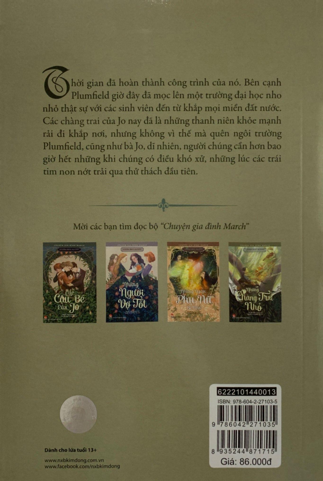 Thời gian đã hoàn thành công trình của nó. Bên cạnh Plumfield giờ đây đã mọc lên một trường đại học nho nhỏ thật sự với các sinh viên đến từ khắp mọi miền đất nước. Các chàng trai của Jo nay đã là những thanh niên khỏe mạnh rải đi khắp nơi, nhưng không vì thế mà quên ngôi trường Plumfield, cũng như bà Jo, dĩ nhiên, người chúng cần hơn bao giờ hết những khi chúng có điều khó xử, những lúc các trái tim non nớt trải qua thử thách đầu tiên.