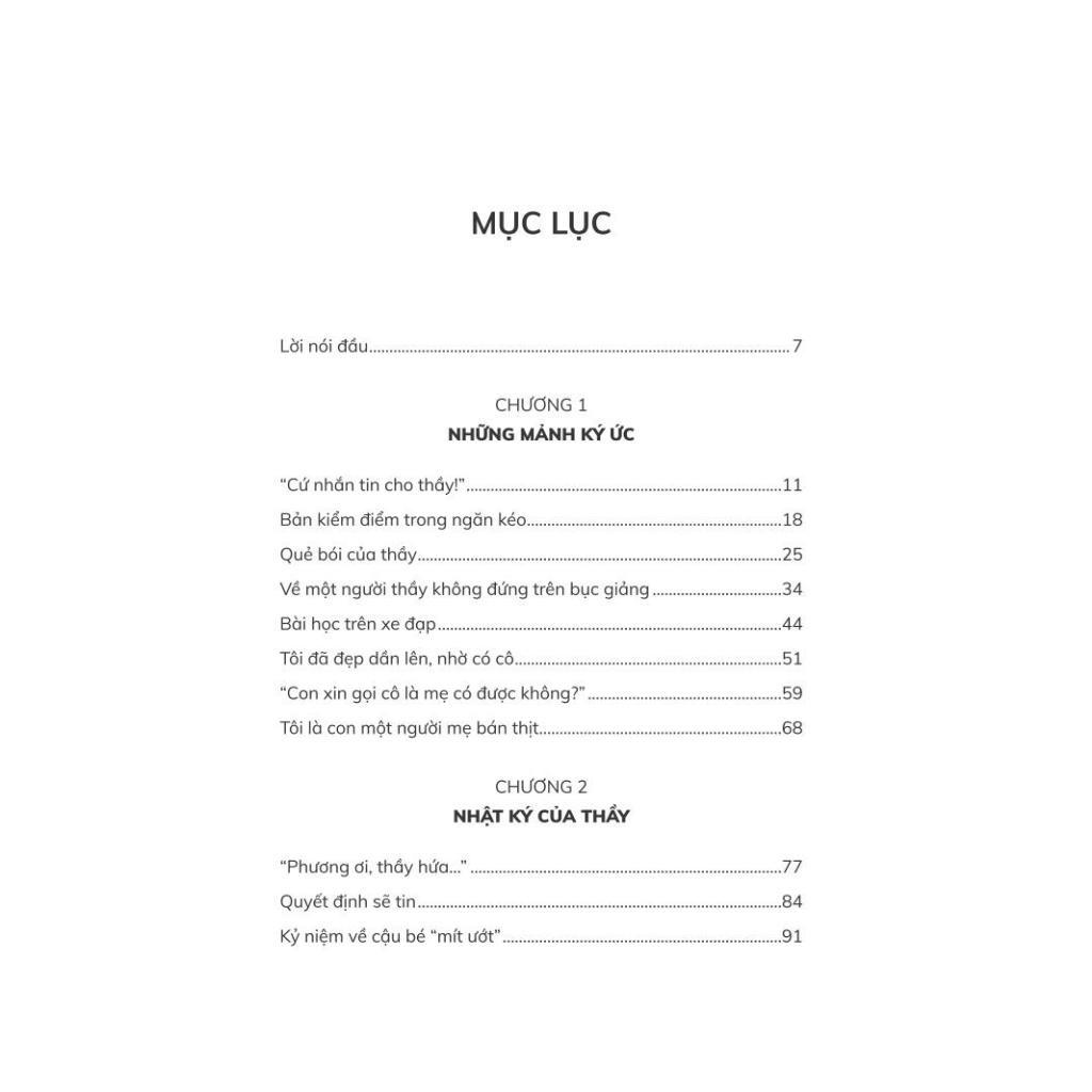 Có rất nhiều câu chuyện cảm động về người thầy, nghề thầy được kể trong cuốn sách ấm áp này. Một tình huống ứng xử tinh tế của người thầy, một bàn tay nâng đỡ khi tuột dốc, một lời nói và hành động truyền cảm hứng, một cơ hội làm lại được trao đi, một sự giúp đỡ thầm lặng, hay tình yêu thương chẳng mưu cầu gì hết ngoài sự vươn lên của đứa trẻ Có những yêu thương và tâm huyết nghề nghiệp vượt rất xa giới hạn trách nhiệm của người thầy như thế.
