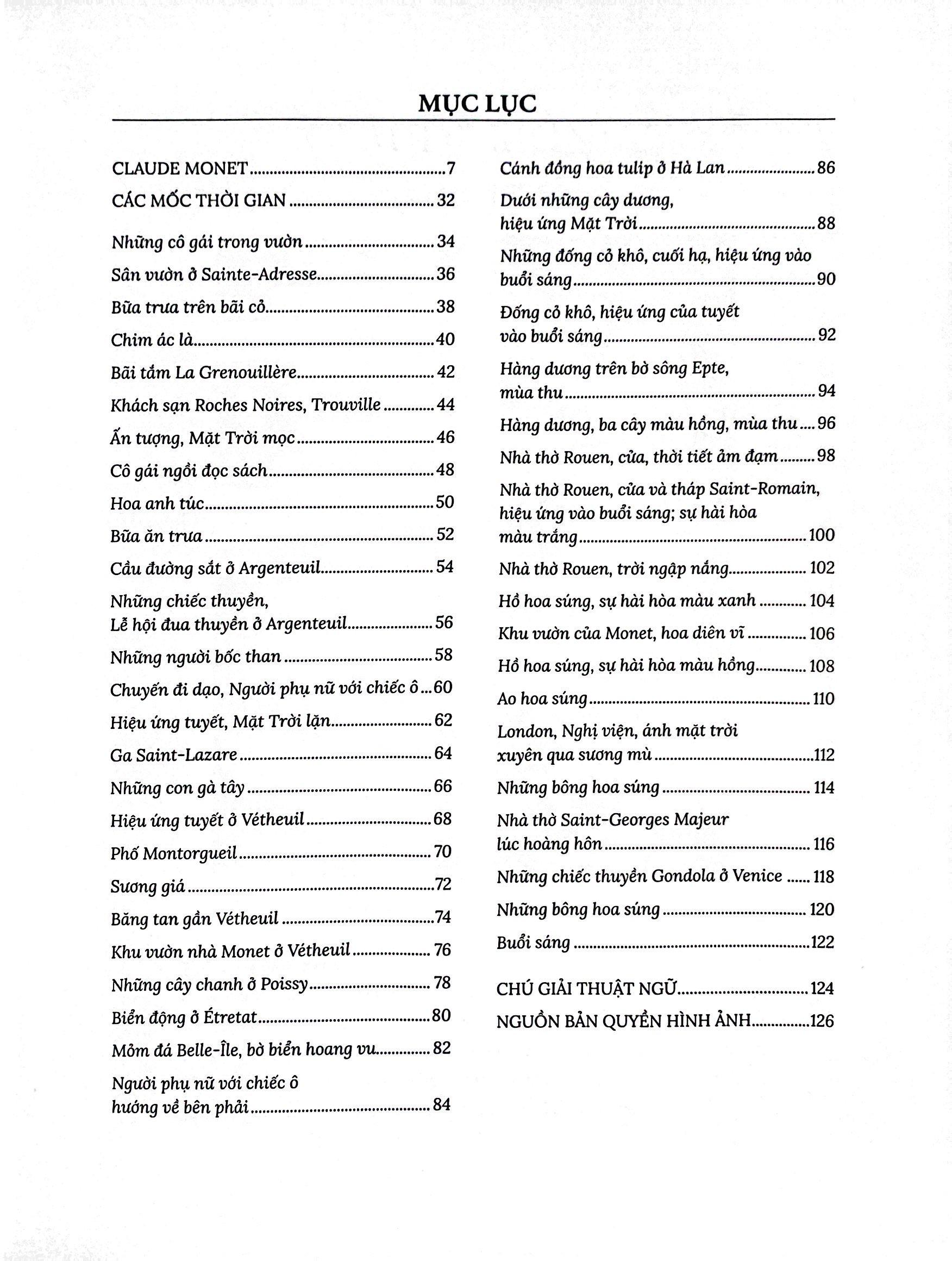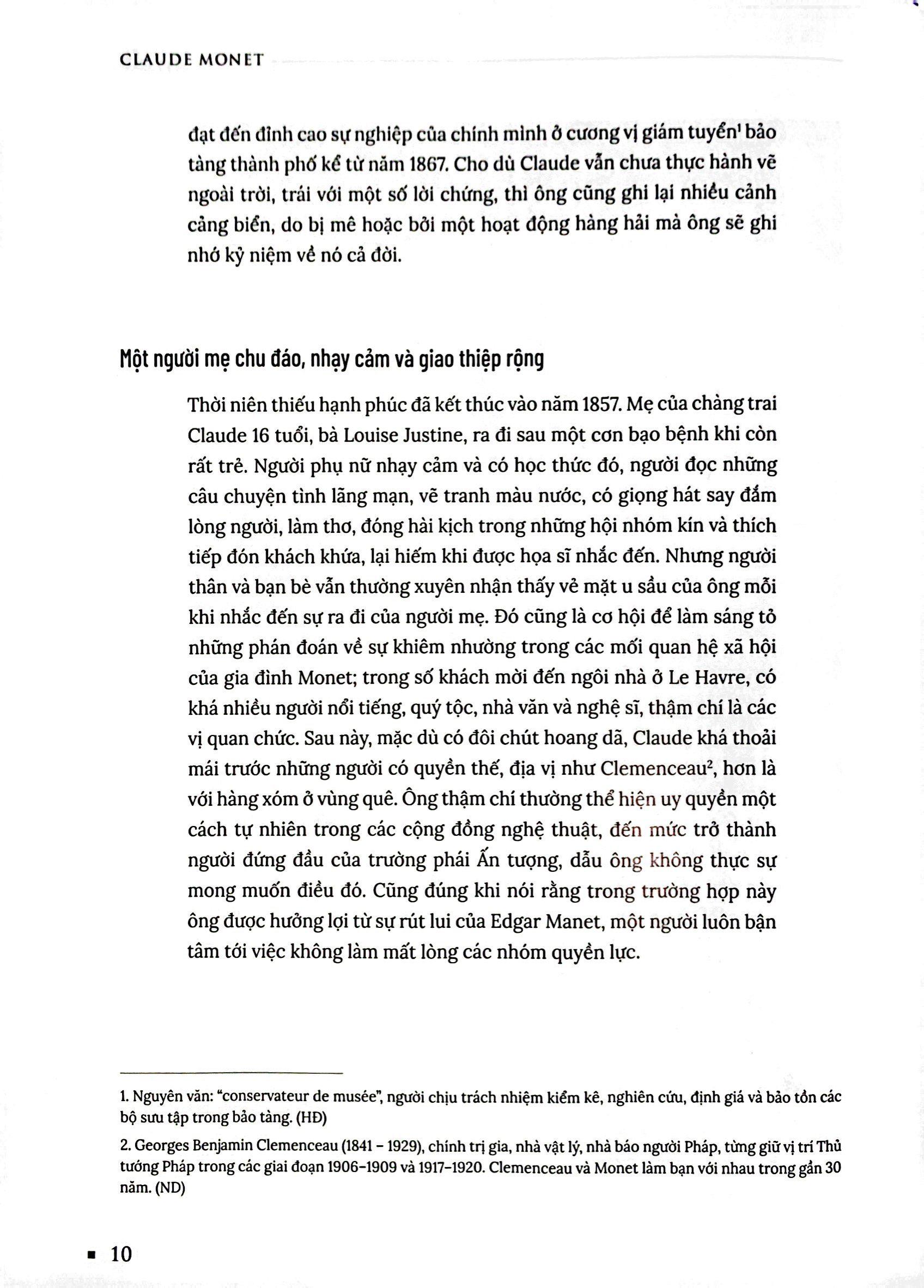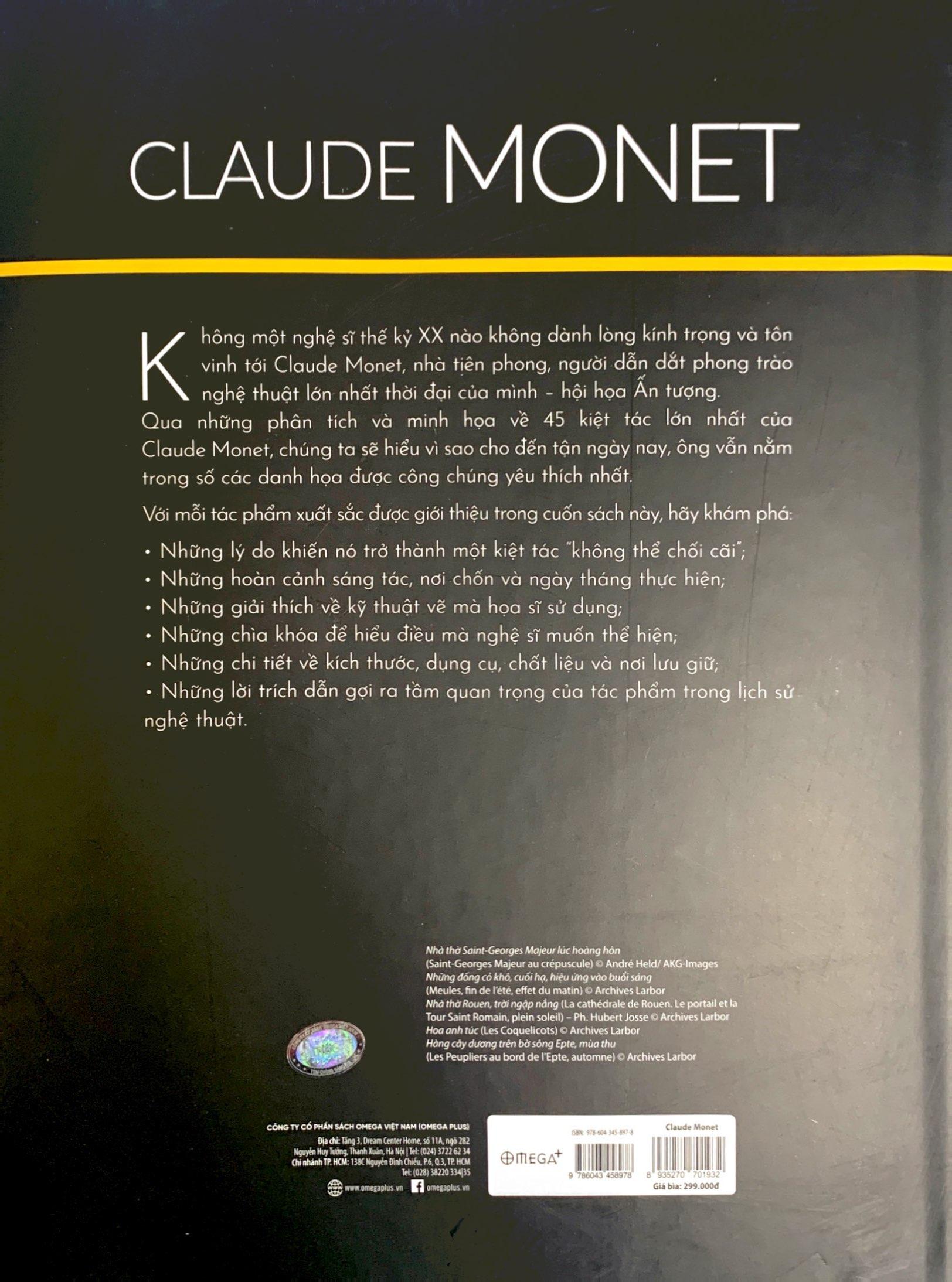 Với lối trình bày rõ ràng, mạch lạc, chia làm hai phần: cuộc đời danh họa và những kiệt tác, cuốn sách sẽ dành cho những người yêu thích danh họa Claude Monet và muốn tìm hiểu, tra cứu thông tin nhanh chóng về cuộc đời ông, cùng 45 kiệt tác mà ông đã để lại.