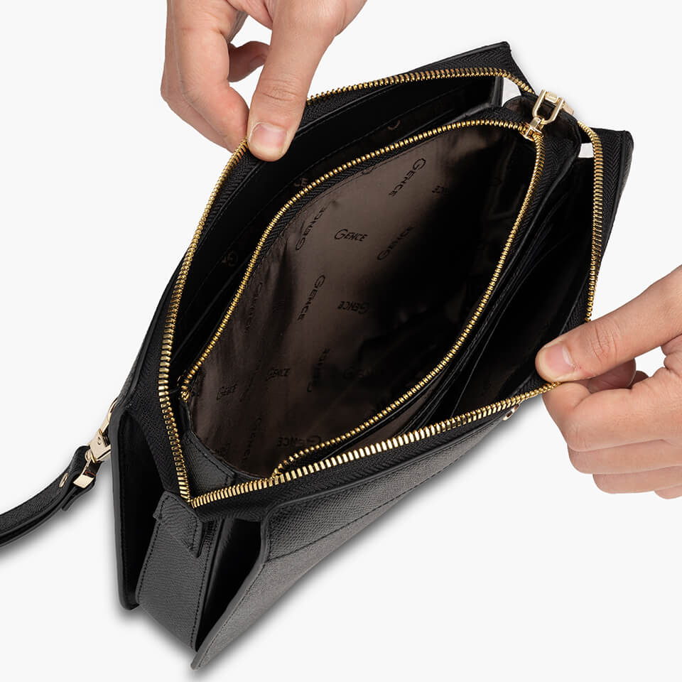 • Kích thước: 25.5cm (dài) x 17cm (rộng) x 7cm (dày) Ví được chia nhiều ngăn với khóa zip trong lồng với khóa ngoài độc đáo