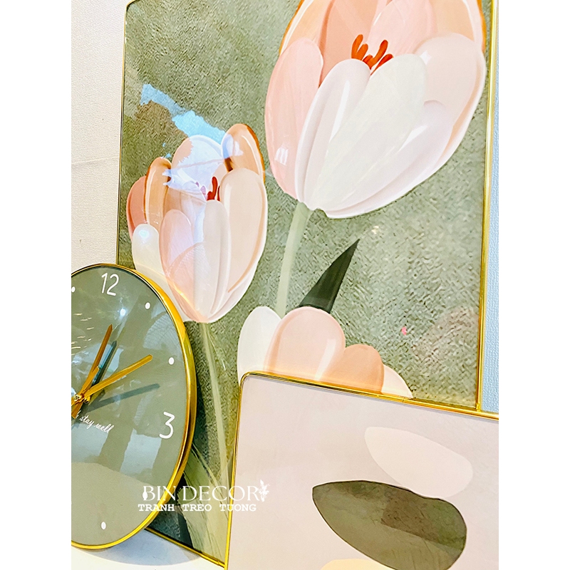 ✨(CÓ ẢNH THẬT) Tranh đồng hồ tráng gương hoa tulip bộ 3 tranh bo viền kèm đinh và pin