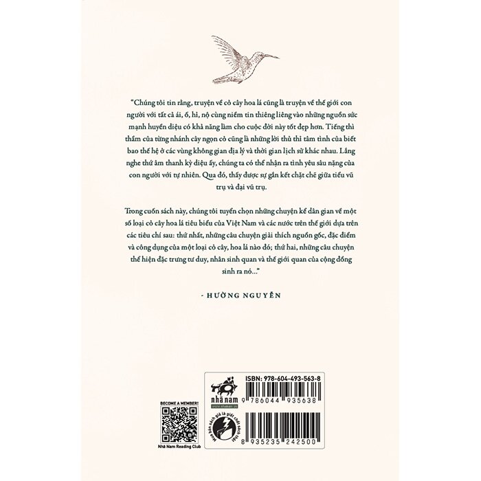 Trong cuốn sách này, chúng tôi tuyển chọn những chuyện kể dân gian về một số loại cỏ cây hoa lá tiêu biểu của Việt Nam và các nước trên thế giới dựa trên các tiêu chí sau: thứ nhất, những câu chuyện giải thích nguồn gốc, đặc điểm và công dụng của một loại cỏ cây, hoa lá nào đó; thứ hai, những câu chuyện thể hiện đặc trưng tư duy, nhân sinh quan và thế giới quan của cộng đồng sinh ra nó.." - Hường Nguyễn