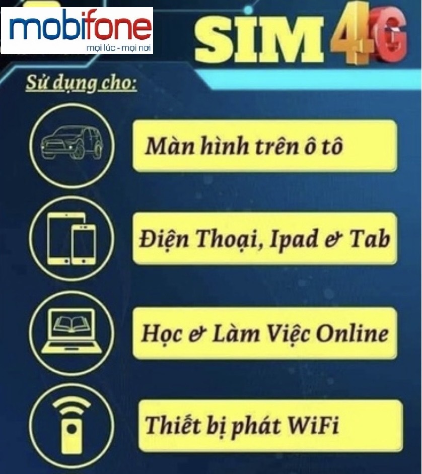 Sim 4G Mobifone MXH80 - 30 ngày - Tặng 1GB/Ngày. Hết ngừng truy cập. - Không Giới Hạn Truy Cập YouTu. - Đã có tháng đầu. Gia hạn 80,000đ/tháng - Phôi sim 4G hỗ trợ cả 3G và 2G. Khu vực chưa phủ sóng 4G hoặc lắp trên thiết bị 3G sẽ dùng 3G, H+, 2G - Sim không nghe gọi, nhắn tin được. Sim 4G Mobifone MXH100 - 30 ngày - Tặng 1GB/Ngày. Hết ngừng truy cập. - Không Giới Hạn Truy Cập YouTu - Face - Tik. - Đã có tháng đầu. Gia hạn 100,000đ/tháng. - Phôi sim 4G hỗ trợ cả 3G và 2G. Khu vực chưa phủ sóng 4G hoặc lắp trên thiết bị 3G sẽ dùng 3G, H+, 2G - Sim không nghe gọi, nhắn tin được. Sim 4G Mobifone KC90 - 30 ngày - Tặng 1GB/Ngày. Hết ngừng truy cập. - Free gọi nội mạng dưới 10 phút và 30 phút ngoại mạng - Đã có tháng đầu. Gia hạn 90,000đ/tháng. - Phôi sim 4G hỗ trợ cả 3G và 2G. Khu vực chưa phủ sóng 4G hoặc lắp trên thiết bị 3G sẽ dùng 3G, H+, 2G Sim 4G Mobifone S135 - 30 ngày - Tặng 6GB/Ngày. Hết ngừng truy cập. - 30GB Mobicloud - Đã có tháng đầu. Gia hạn 1350,000đ/tháng. - Phôi sim 4G hỗ trợ cả 3G và 2G. Khu vực chưa phủ sóng 4G hoặc lắp trên thiết bị 3G sẽ dùng 3G, H+, 2G - Sim không nghe gọi, nhắn tin được. Sim 4G Mobifone S159 - 30 ngày - Tặng 6GB/Ngày. Hết ngừng truy cập. - Không Giới Hạn Truy Cập YouTu - Face. - 30GB Mobicloud - Free gọi nội mạng dưới 20 phút và 200 phút ngoại mạng - Đã có tháng đầu. Gia hạn 159,000đ/tháng. - Phôi sim 4G hỗ trợ cả 3G và 2G. Khu vực chưa phủ sóng 4G hoặc lắp trên thiết bị 3G sẽ dùng 3G, H+, 2G.