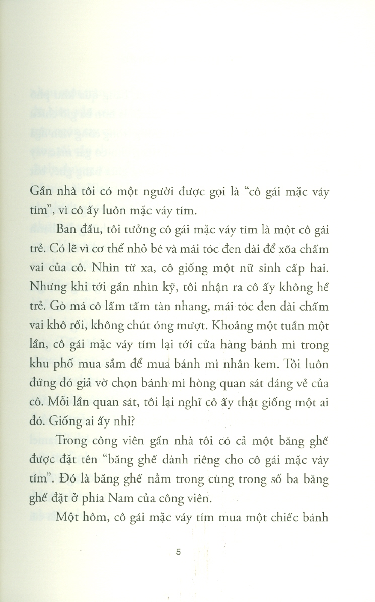 Trong mắt mọi người, “cô gái mặc váy tím” hết sức kỳ dị và không ai có thể tiếp cận. Nhưng với “tôi”, người con gái ấy lại có một sức cuốn hút vô cùng kỳ lạ. “Tôi” muốn kết bạn với “cô gái mặc váy tím” bằng mọi giá. Cuối cùng, “tôi” đã tìm cách để “cô gái mặc váy tím” tới làm cùng một chỗ với mình. Nhưng “tôi” là ai? Và mong ước thực sự của “tôi” là gì?