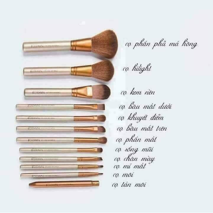 - Bộ Cọ Trang Điểm gồm 12 cây cọ với đầy đủ chức năng trang điểm cơ bản như đánh : phấn phủ, má hồng, kem nền, kem che khuyết điểm, cọ tạo khối, các loại cọ tán phấn mắt ( bao gồm cọ tán đầu dẹp và cọ tán đầu tròn), eyeliner, chải chân mày, vẽ môi và chải mi. Đặc điểm: .
