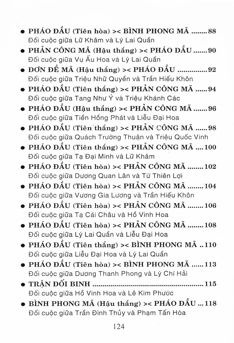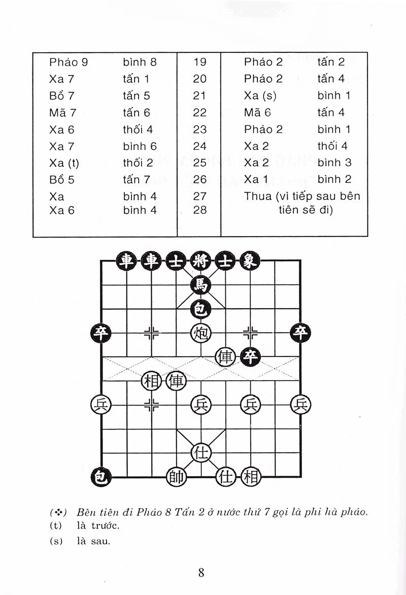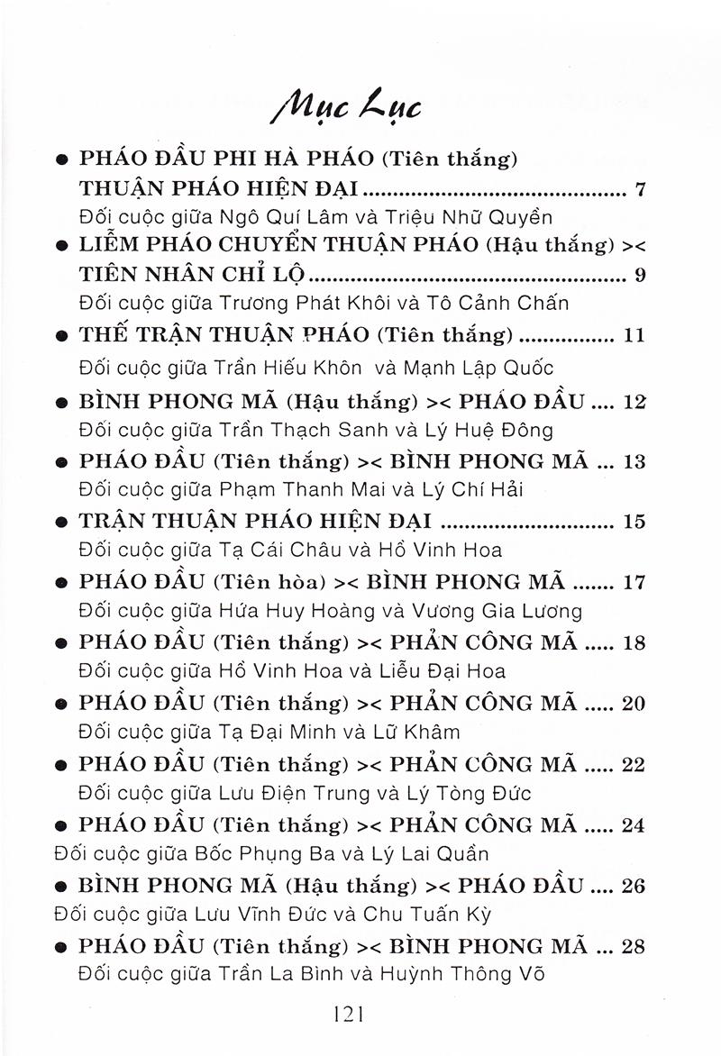 Tượng Kỳ Hậu Vệ Cuốn sách Tượng kỳ hậu vệ gồm 5 phần: Phần thứ nhất: Bình phong mã đối đương đầu pháo quá hà xe, bình xe áp mã cuộc (gồm 5 cuộc) Cuộc