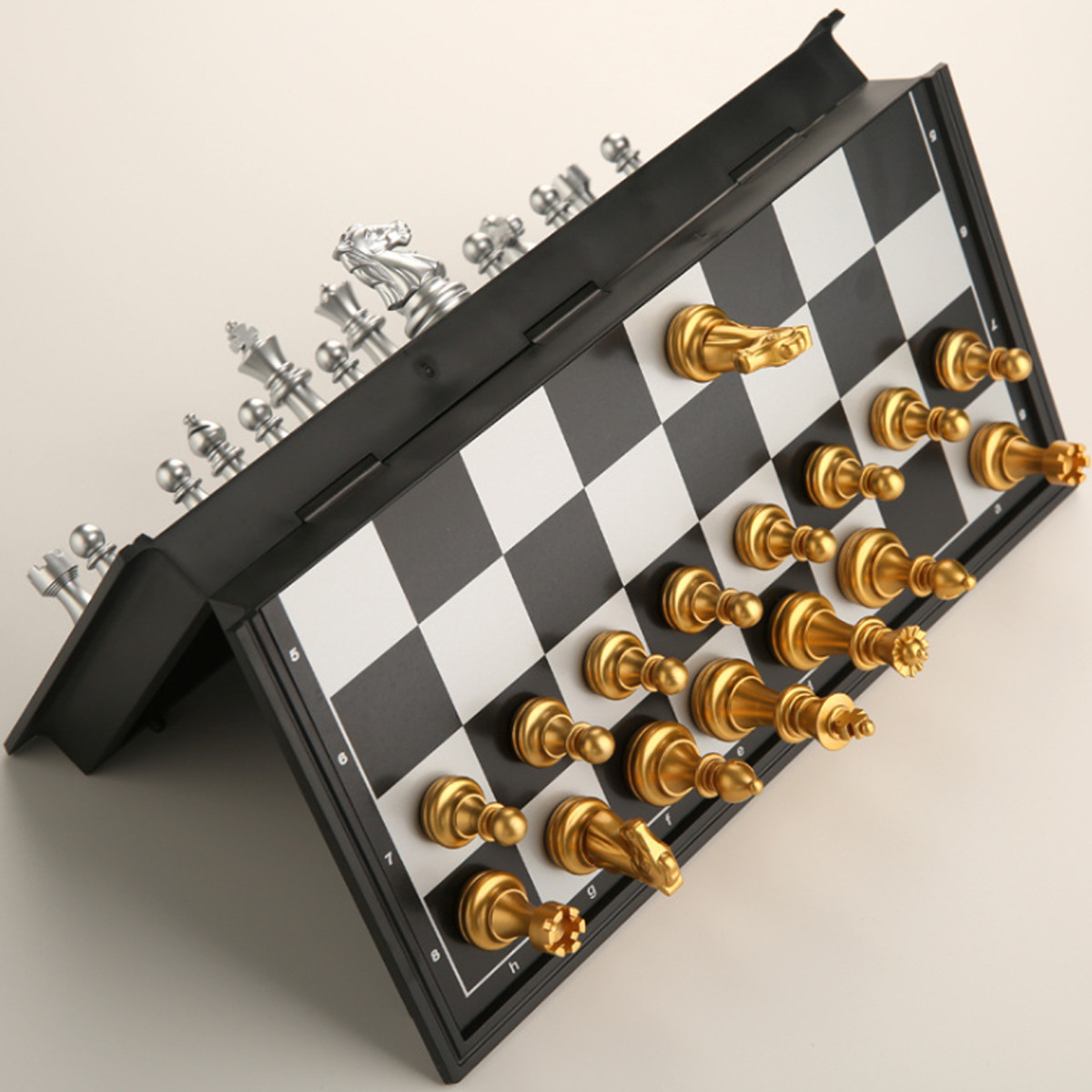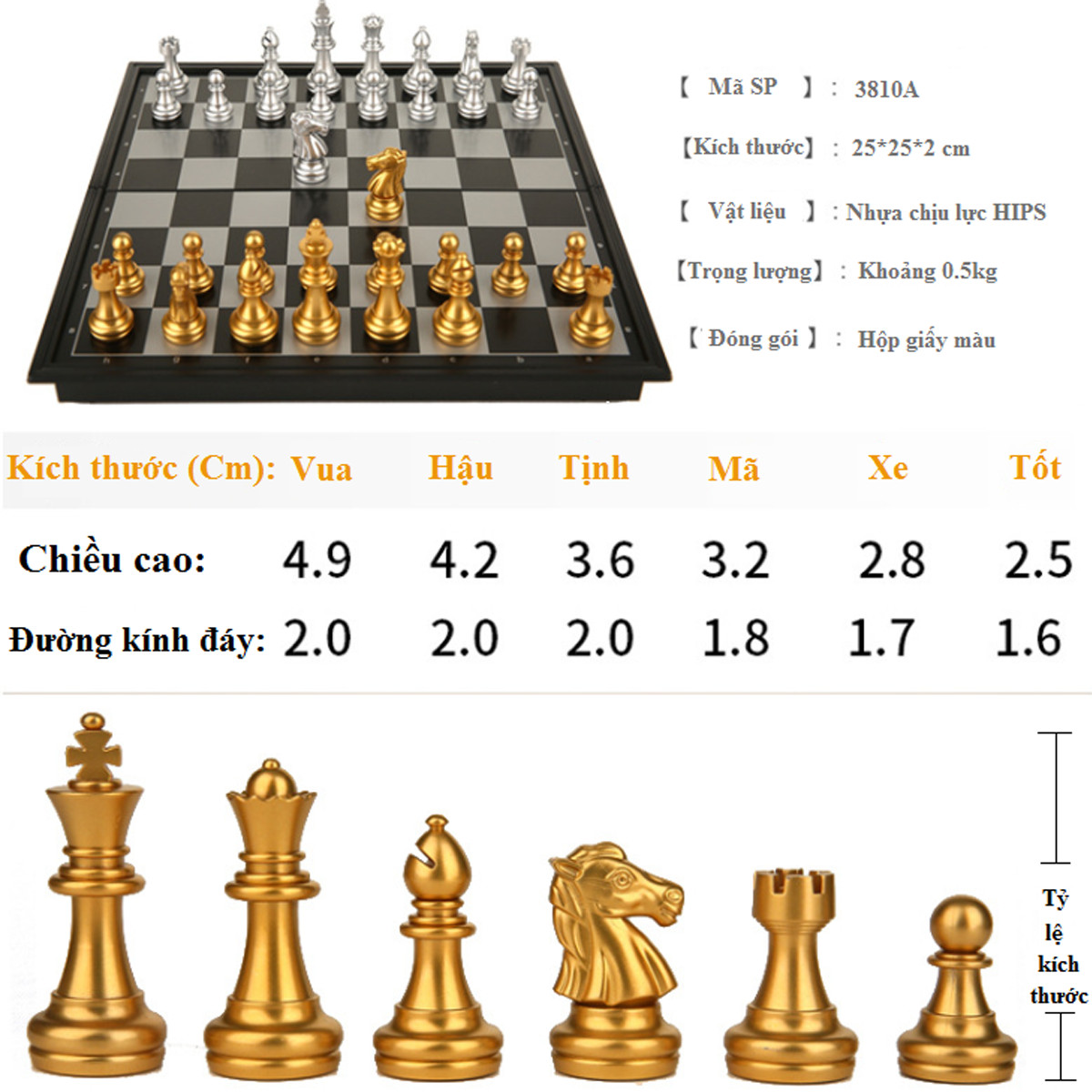 - Bộ cờ vua gấp lại có kích thước nhỏ gọn rất tiện mang theo để thư giãn trong những giờ giải lao trên lớp, văn phòng, đi công tác. Thông Tin Chi Tiết Bộ Cờ Vua Tiêu Chuẩn Quốc Tế Gắn Nam Châm Màu Vàng – Bạc Có 3 KÍCH THƯỚC Lựa Chọn Rộng x Dài x Dày (Cm): Bàn cỡ ĐẠI 4912A: 36 × 36 x 2 cm Bàn cỡ TO 4812A: 32 × 32 x 2 cm Bàn cỡ NHỎ 3810A: 25 × 25 x 2 cm Bàn cờ Vua kích thước chuẩn quốc tế, làm bằng nhựa cứng ABS, Mở ra làm bàn, đóng lại là hộp đựng. Sử dụng sản phẩm chính hãng để tránh hàng giả hàng nhái, hàng kém chất lượng nhé.