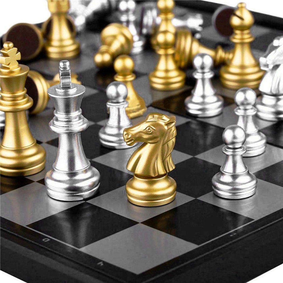 Bộ Bàn Cờ Vua Cỡ To bao gồm 1 bàn cờ nhựa và 32 quân cờ, với 2 màu sắc Vàng – Bạc sang trọng. Quân cờ được làm từ chất liệu nhựa cao cấp, bền đẹp và sáng bóng. Đặc biệt có nam châm giúp cho quân cờ luôn đứng vững không đổ hay bị xê dịch.