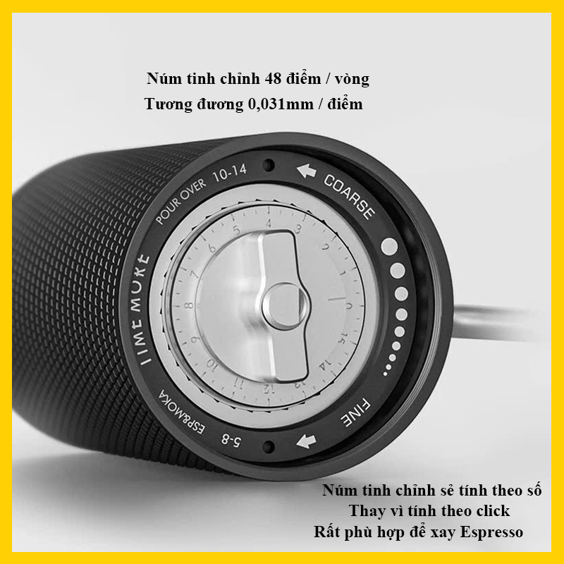 C5: Điều chỉnh cỡ xay dễ dàng với hệ thống click vi chỉnh 0,031mm / điểm, tương ứng 48 điểm/ vòng.