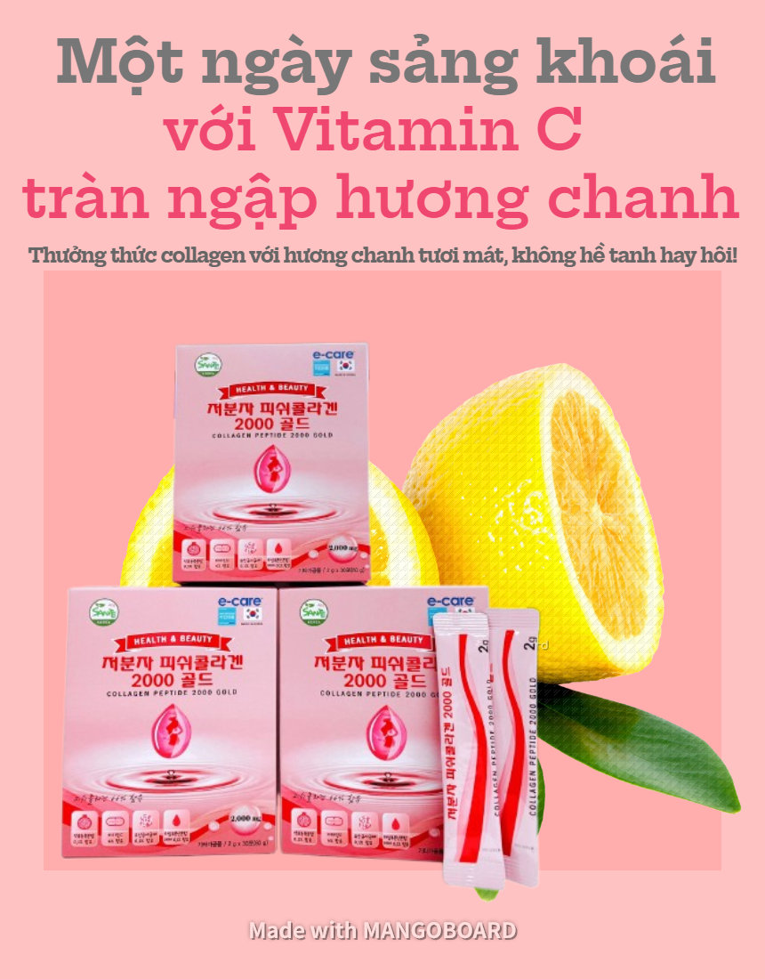 - Mùi vị: collagen cá nhưng không tanh cá nhờ sự kết hợp cùng vitamin C, vị chanh Hàn Quốc, giúp collagen trở nên ngon hơn và dễ uống hơn Thành phần chính:Collagen peptide từ cá (cá: từ Bangladesh, Việt Nam) (1320 mg), vitamin C (ascorbic acid) (89 mg), hỗn hợp axit hyaluronic (axit hyaluronic, dextrin) (2 mg), vitamin B2 (riboflavin) (0.2 mg) Thành phần khác:Bột tinh thể glucose, bột hương chanh [đường trắng, bột tinh thể glucose, bột cô đặc chanh (dextrin, chanh cô đặc: Israel), bột hương chanh (hương liệu tổng hợp), axit xitric], xylitol, bột hương chanh (hương thơm tổng hợp) , whey canxi (sữa, sản phẩm của Đức), cỏ ngọt được xử lý bằng enzym, citric acid anhydrous, bột lựu cô đặc [dextrin, lựu cô đặc (lựu Iran)], bột Lactobacillus (từ đậu nành). Công dụng: Công dụng đối với da: