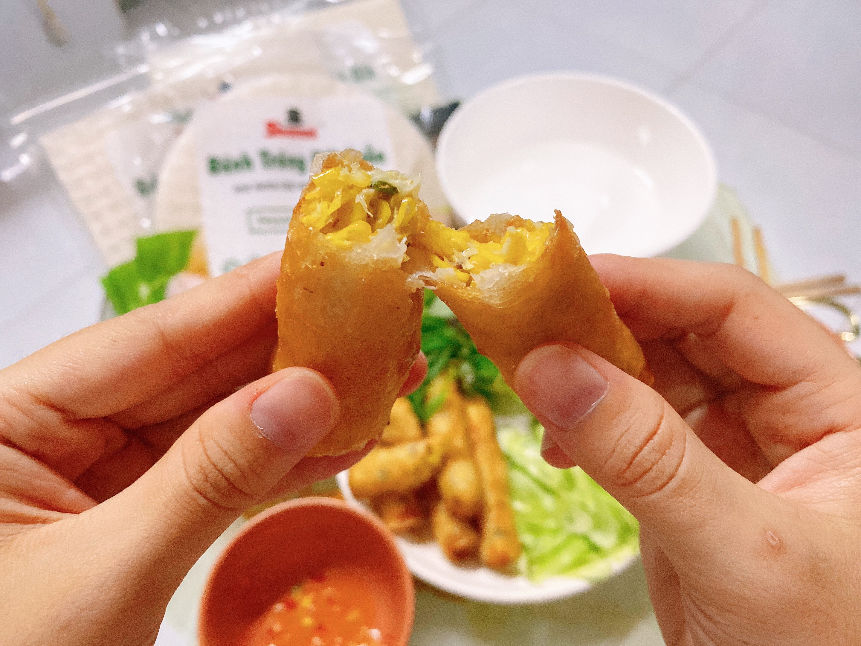 2/ Đặt phần nhân chả giò vào bánh tráng.