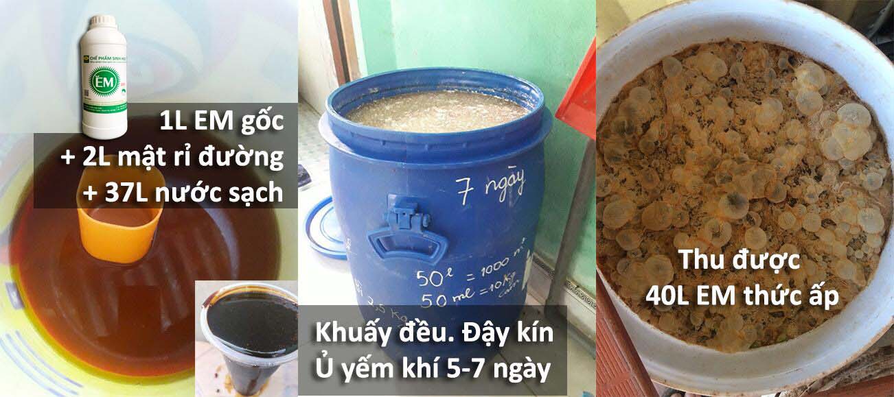 [ 1 lít Chế phẩm EM gốc + 2 lít mật rỉ đường (hoặc đường đỏ) + 37 lít nước = 40 lít EM thứ cấp ]