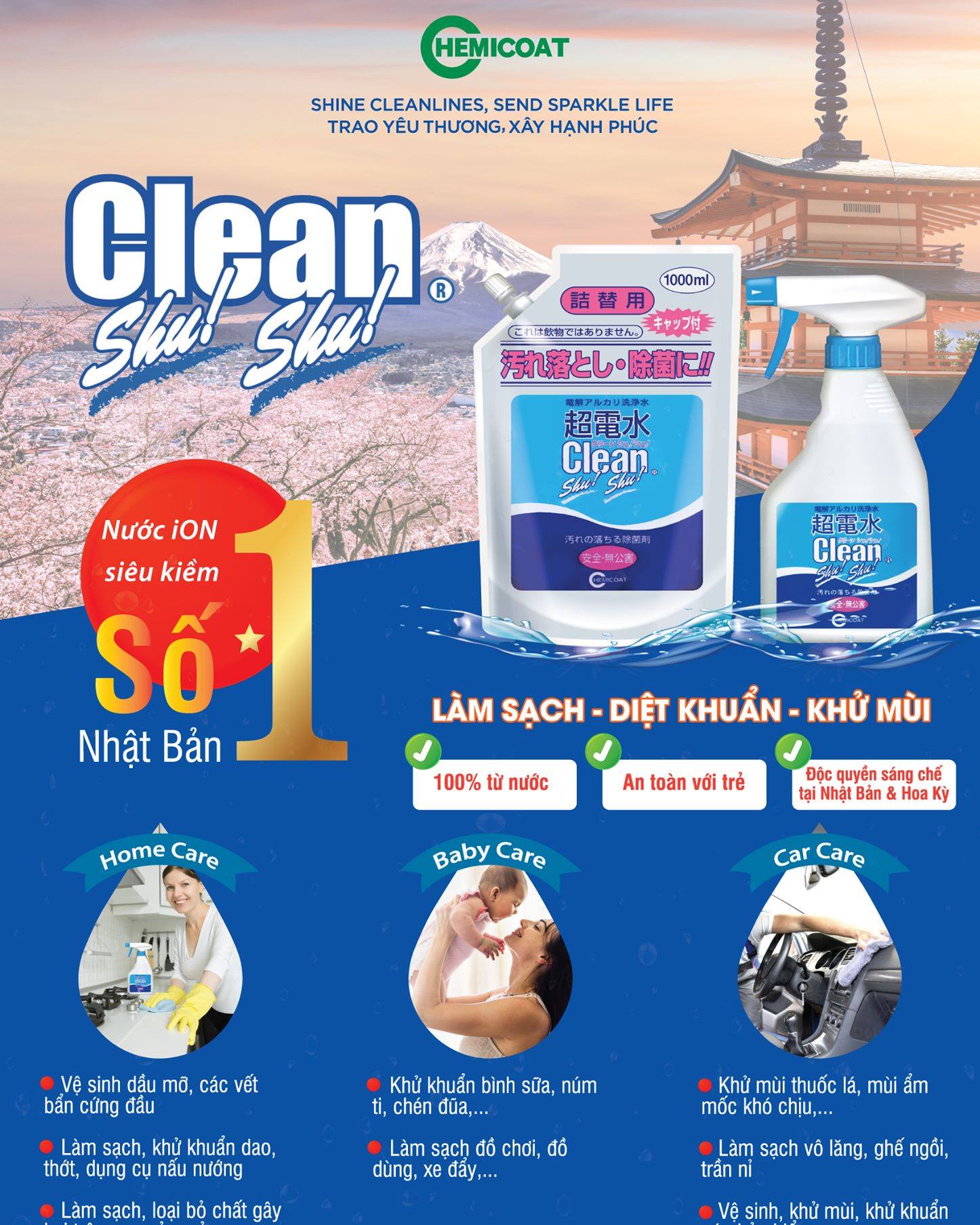 Clean Shu! Shu! Vệ sinh & khử mùi nội thất ô tô_100% nước ion kiềm