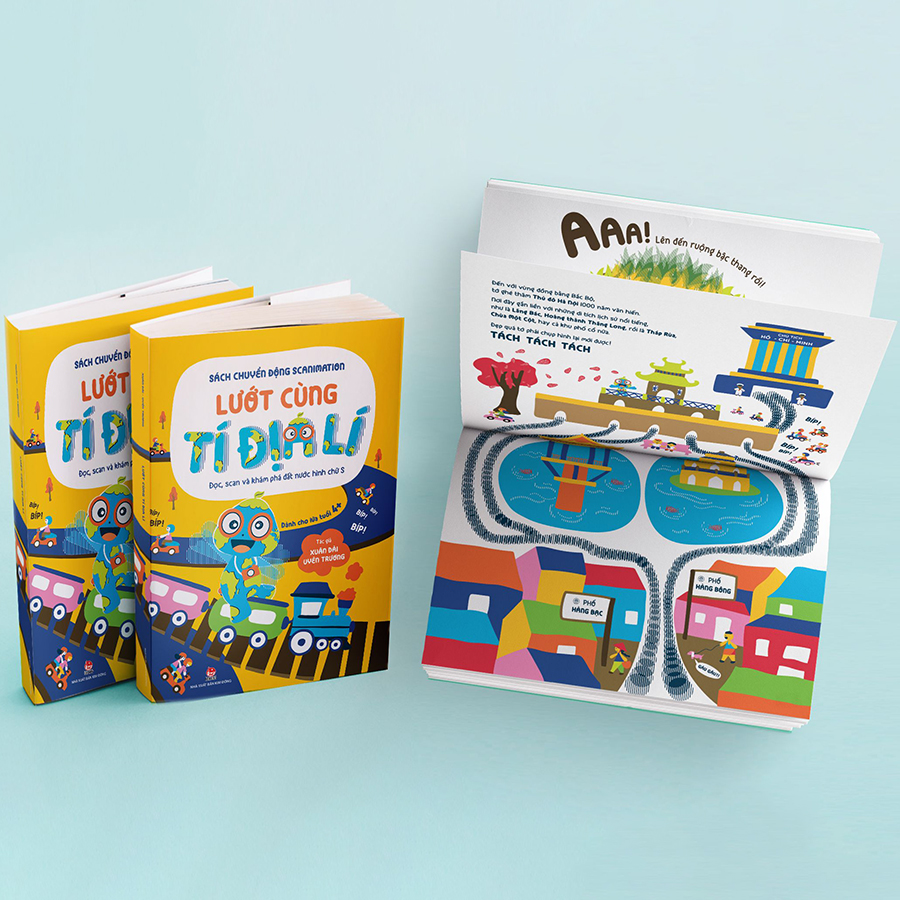 Sách Chuyển Động Scanimation - Lướt Cùng Tí Địa Lí ------------ Lướt cùng Tí Địa Lí – quyển sách chuyển động scanimation đầu tiên của tác giả Việt Nam, dành cho lứa tuổi 4+