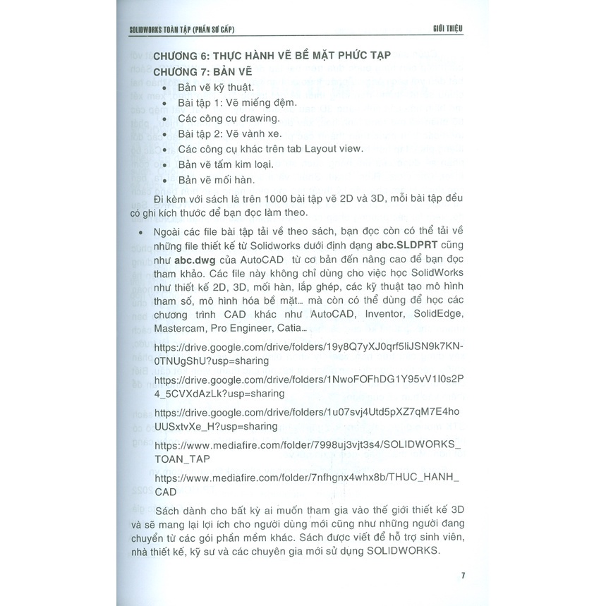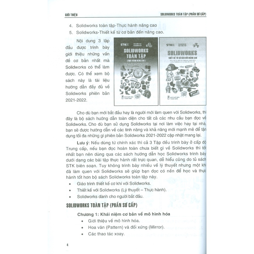 Lưu ý: Nếu dùng từ chính xác thì các Tập từ 1 đến 3 đều trình bày ở cấp độ Trung cấp và các Tập từ 4 đến 5 trình bày ở cấp độ Cao cấp, nếu bạn đọc hoàn toàn chưa biết gì về Solidworks thì tốt nhất bạn nên dùng qua các sách hướng dẫn học Solidworks trình bày dưới dạng các bài tập thực hành rất trực quan, dễ hiểu cũng do tủ sách STK biên soạn. Tuy không trình bày nhiều về lý thuyết nhưng một khi đã làm quen với Solidworks sẽ giúp bạn đọc có nền để học và thực hành tốt hơn bộ sách Solidworks toàn tập này.