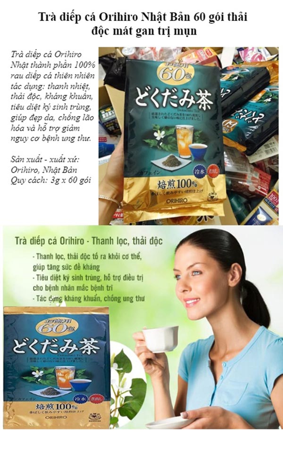 - Trà diếp cá Orihiro hỗ trợ điều trị mụn nội tiết, giúp kích thích tiêu hóa, cân bằng nội tiết tố cơ thể giúp duy trì sức khoẻ, sắc đẹp.