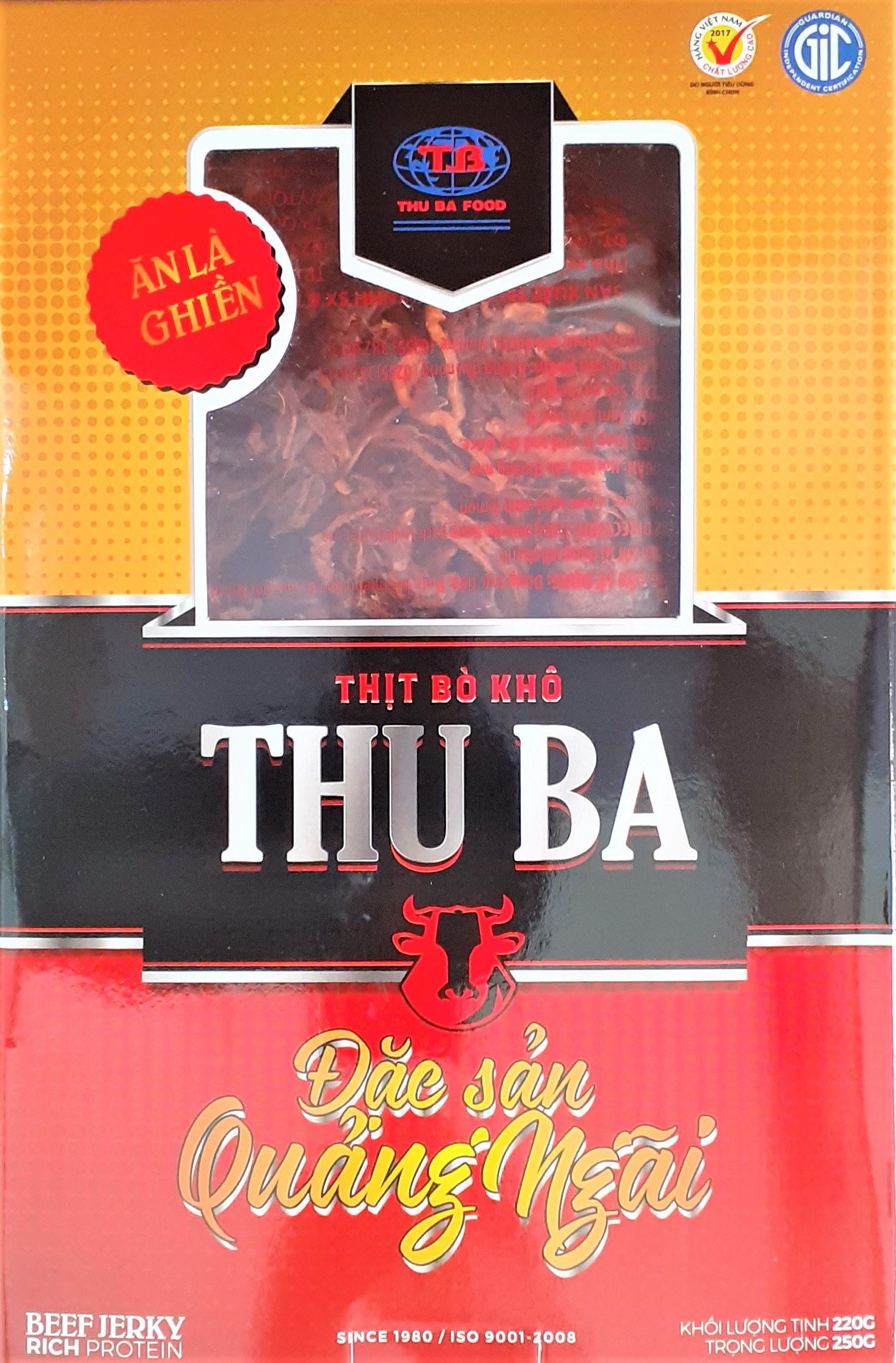 BÒ KHÔ THU BA là món đặc sản Quảng Ngãi, đạt tiêu chuẩn ISO 9001:2015 và là Hàng Việt Nam Chất Lượng Cao do Người tiêu dùng bình chọn 2017, 2018, 2019 và 2020.