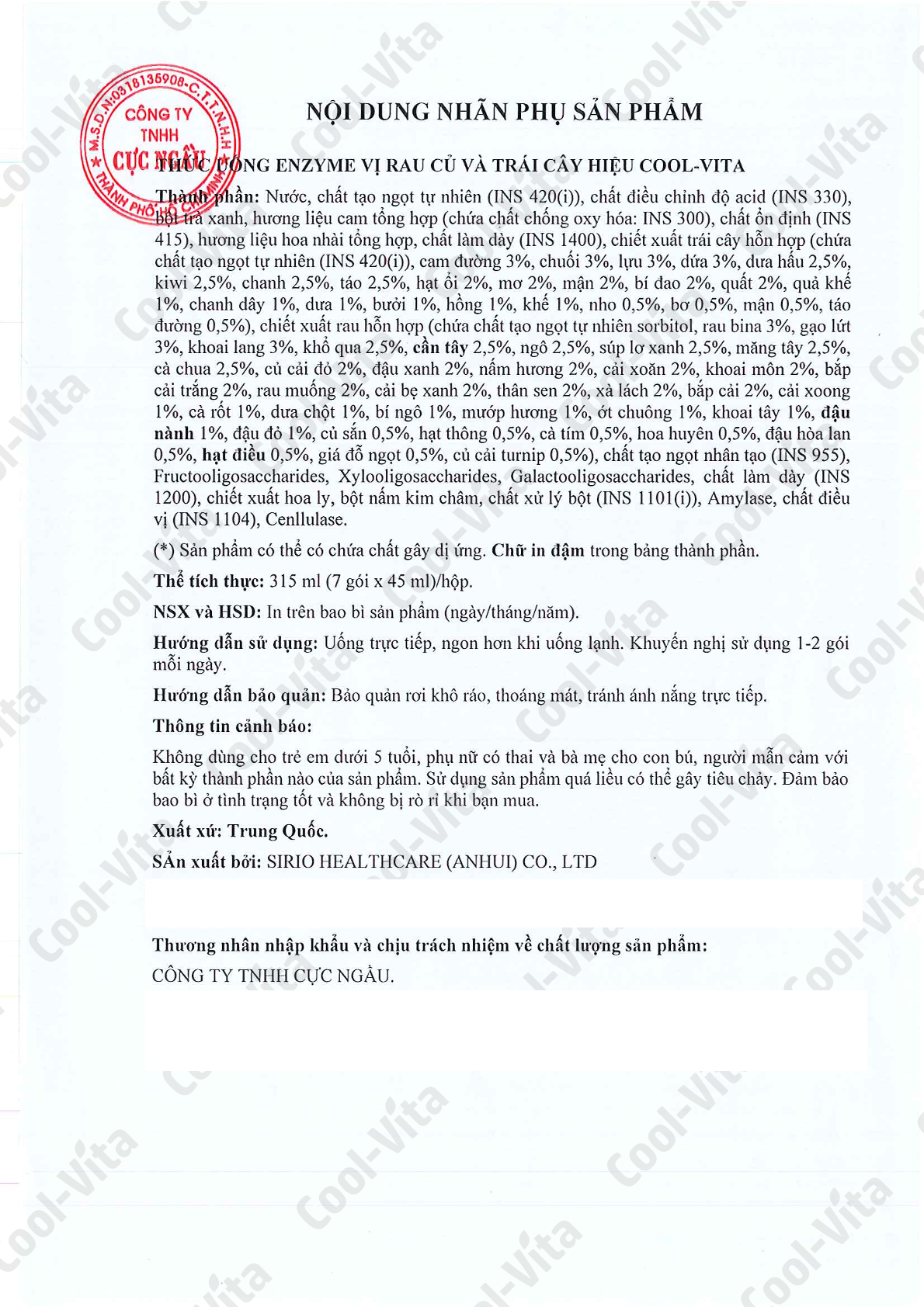 - Thành phần: Nước, chất tạo ngọt tự nhiên (INS 420(i)), chất điều chỉnh độ acid (INS 330), bột trà xanh, hương liệu cam tổng hợp (chứa chất chống oxy hóa: INS 300), chất ổn định (INS 415), hương liệu hoa nhài tổng hợp, chất làm dày (INS 1400), chiết xuất trái cây hỗn hợp (chứa chất tạo ngọt tự nhiên (INS 420(i)), cam ngọt 3%, chuối 3%, lựu 3%, dứa 3%, dưa hấu 2,5%, kiwi 2,5%, chanh 2,5%, táo 2,5%, hạt ổi 2%, mơ 2%, mận 2%, bí đao 2%, quất 2%, quả khế 1%, quả chanh dây 1%, dưa 1%, bưởi 1%, hồng 1%, khế 1%, nho 0,5%, bơ 0,5%, mận (quả roi) 0,5%, táo đường (0,5%), chiết xuất rau hỗn hợp (chứa chất tạo ngọt tự nhiên sorbitol, rau bina 3%, gạo lứt 3%, khoai lang 3%, dưa chuột đắng 2,5%, cần tây 2,5%, ngô 2,5%, súp lơ xanh 2,5%, măng tây 2,5%, cà chua 2,5%, củ cải đỏ 2%, đậu xanh 2%, nấm hương 2%, cải xoăn trung quốc 2%, khoai môn 2%, bắp cải trắng 2%, rau muống 2%, cải bẹ xanh 2%, thân sen 2%, xà lách 2%, bắp cải cải 2%, cải xoong 1%, cà rốt 1%, dưa chuột 1%, bí ngô 1%, mướp hương 1%, ớt chuông 1%, khoai tây 1%, đậu nành 1%, đậu đỏ 1%, củ sắn 0,5%, hạt thông 0,5%, cà tím 0,5%, hoa huyên 0,5%, đậu hòa lan 0,5%, hạt điều 0,5%, giá đỗ ngọt 0,5%, củ cải turnip 0,5%), chất tạo ngọt nhân tạo (INS 955), Fructooligosaccharides, Xylooligosaccharides, Galactooligosaccharides, chất làm dày (INS 1200), chiết xuất hoa ly, bột nấm kim châm, chất xử lý bột (INS 1101(i)), Amylase, chất điều vị (INS 1104), Cenllulase.