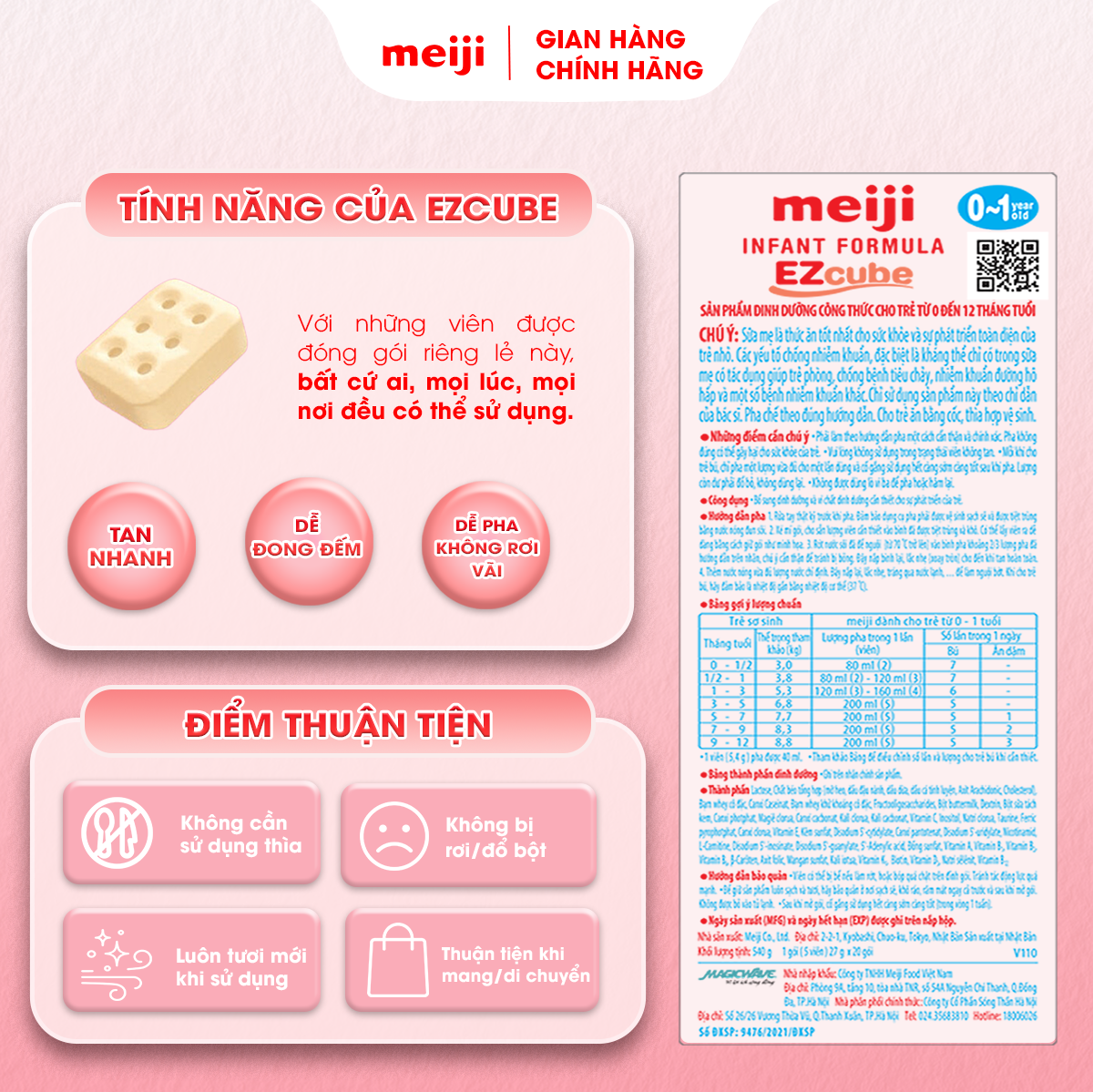 - Ưu điểm sản phẩm Meiji Infant Formula EZcube dạng viên được đóng gói trong túi nhỏ gọn, mẹ chỉ cần mang vài thanh thay vì mang lon sữa cồng kềnh và đặc biệt dễ dàng thuận tiện khi pha, không lo rơi vãi, không sợ đong nhầm. CÔNG DỤNG SẢN PHẨM