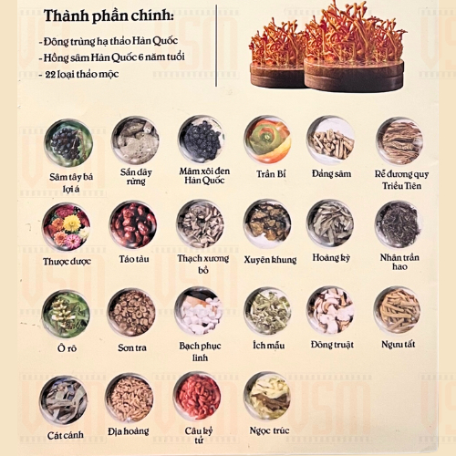 - Chiết xuất hồng sâm 3,5%, hồng sâm cô đặc 0,02%