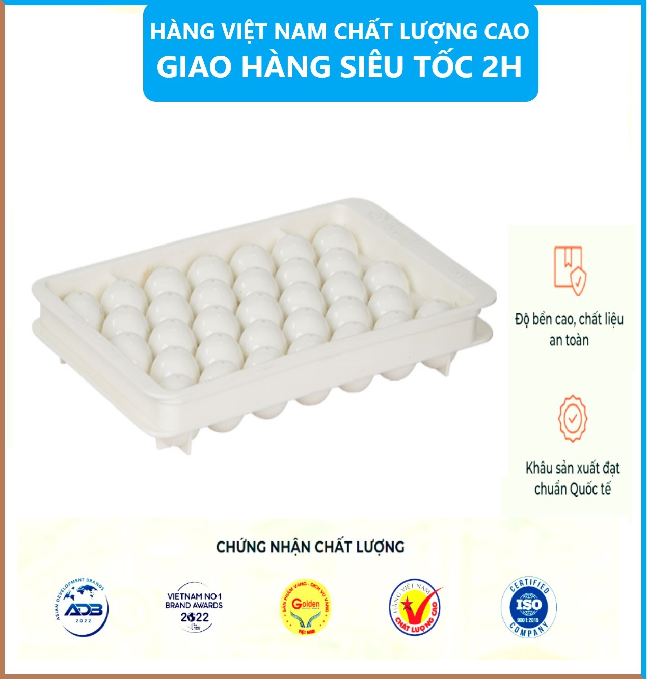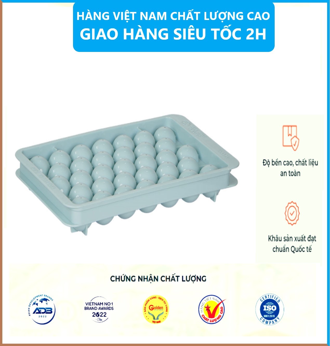 Khay đá nhà Việt Nhật được sản xuất theo tiêu chuẩn của các thị trường khó tính như: Hoa Kì , EU , Nhật Bả chất liệu được làm từ 100% nhựa nguyên sinh PP , có kiểm định hoàn toàn an toàn cho người dùng