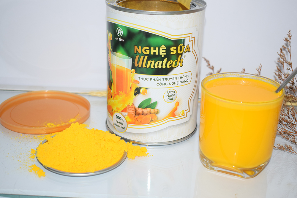 NGHỆ SỮA ULNATECH. Tên sản phẩm: Nghệ sữa Nano Ulnatech. Dạng bột. Màu sắc: Vàng cam. Thành phần: Tinh nghệ nano curcumin, Sữa nhập khẩu tách béo Newzealand. Hàm lượng Nano Curcumin: 23.000mg/kg Công nghệ