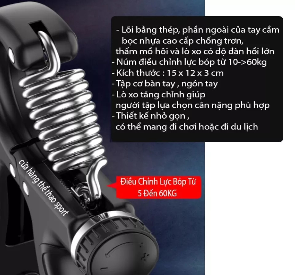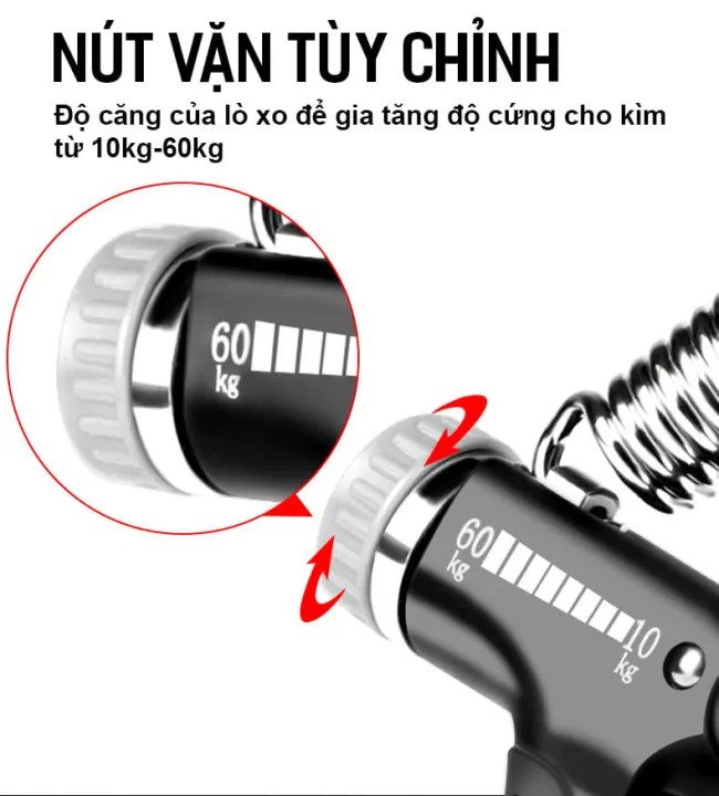 - Có núm điều chỉnh lực bóp từ 5 - 60kg giúp người tập lựa chọn cân nặng phù hợp.
