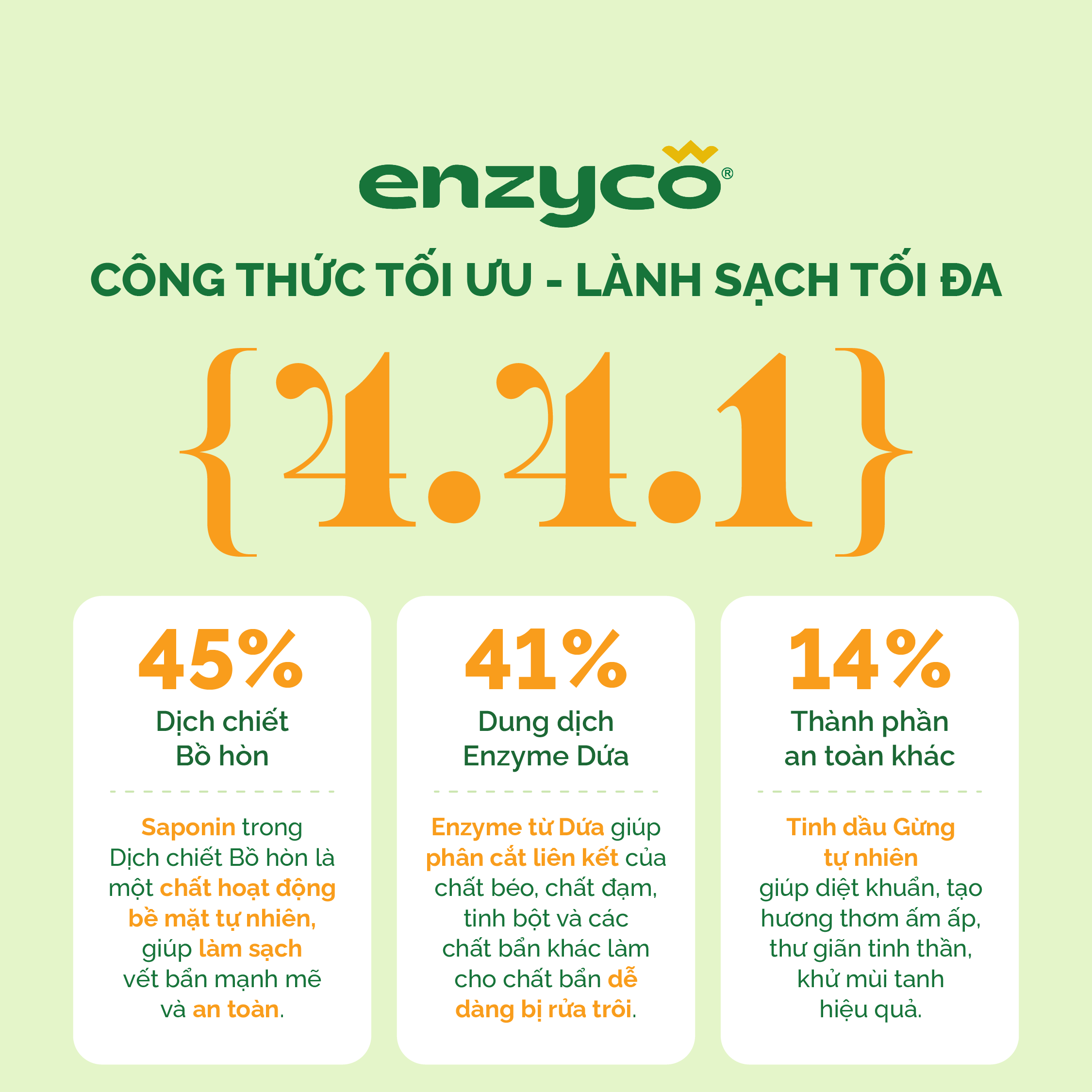 Nước rửa chén bát Enzyco là dòng nước rửa bát sinh học cao cấp từ Dịch chiết Bồ hòn và Dung dịch Enzyme Dứa, có khả năng diệt khuẩn tự nhiên cùng hương thơm từ tinh dầu gừng ta. Làm sạch mạnh mẽ mà vẫn lành tính.