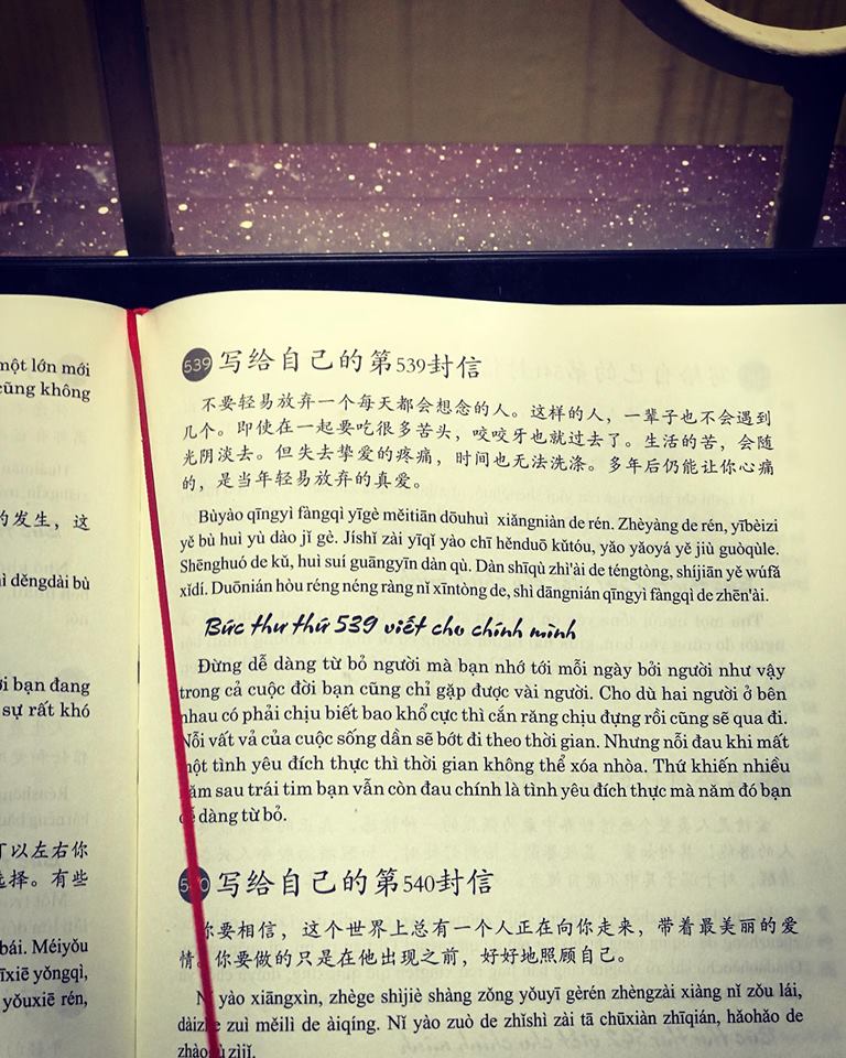 - Giới thiệu sách: 999 Bức Thư Viết Cho Chính mình (Song Ngữ Trung Việt Có Phiên Âm) - (Bản dịch chuẩn và đầy đủ) Tác giả: Nhật Phạm Số trang: 509 Năm phát hành: 2021 Công ty phát hành: Tuệ Lâm Linh Nhà xuất bản Hồng Đức Với nền văn hóa lâu đời đặc sắc và vô cùng phong phú của Trung Quốc, ngôn ngữ Trung trở thành một ngôn ngữ được nhiều bạn trẻ trên thế giới yêu thích, trong đó có Việt Nam. Những cuốn sách song ngữ có phiên âm mang màu sắc hạt giống tâm hồn vừa giúp người học tiếng Trung nâng cao thêm vốn từ vựng, cách diễn đạt, vừa giúp họ làm mát tinh thần, chiêm nghiệm được nhiều triết lí sống chưa được ấn hành nhiều ở Việt Nam. Với mong muốn giúp những bạn trẻ yêu thích tiếng Trung nhưng trình độ chưa cao có thể tiếp cận được với những triết lí của cuộc sống cũng như phát triển được ngôn ngữ, chúng tôi xin được giới thiệu cuốn sách 999 bức thư viết cho chính bạn với phiên bản đầy đủ chữ Hán, phiên âm, tiếng Việt. Hi vọng rằng cuốn sách mà chúng tôi ví như một chai nước dành cho những kẻ bộ hành giữa sa mạc sẽ giúp ích được cho nhiều người trẻ có thêm nhiều năng lượng, động lực, sự tự tin để bước về phía trước. Các bạn đọc đi, tin tôi đi, các bạn có thể không cần một đôi giày xịn, một chiếc áo đẹp, nhưng cuốn sách này thì nên có, sẽ là báu vậtgối đầu giường của các bạn học tiếng Trung. Bức thư số 1 viết gửi bản thân: Bắt đầu từ ngày hôm nay, mỗi ngày đều phải mỉm cười, trên đời này, ngoài cái chết, tất cả chỉ đều là chuyện nhỏ. Cho dù có gặp phải chuyện buồn gì, cũng đừng tự làm khó bản thân; mặc cho ngày hôm nay có bao điều tồi tệ xảy ra, cũng đừng cảm thấy đau buồn. Ngày hôm nay là ngày bạn trẻ tuổi nhất trong tất cả những chuỗi ngày sau này, bởi vì còn có ngày mai, cho nên hôm nay mãi mãi vẫn chỉ là điểm xuất phát. 写给自己的第1封信 从今天开始,每天微笑吧,世上除了生死,都是小事。不管遇到了什么烦心事,都不要自己为难自己;无论今天发生多么糟糕的事,都不应该感到悲伤。今天是你往后日子里最年轻的一天了,因为有明天,今天永远只是起跑线。