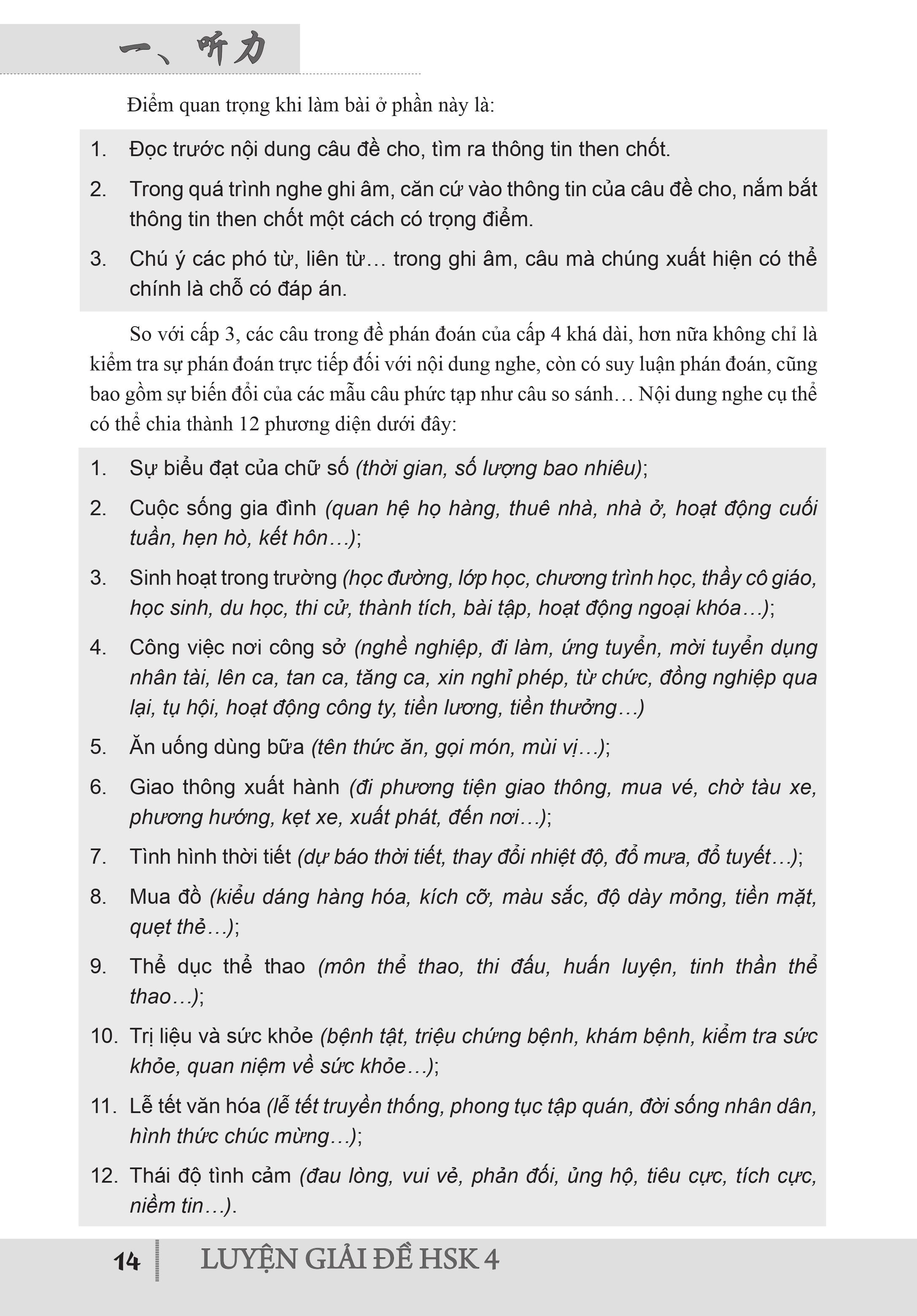 - Phần 3: Thuyết minh đáp án (cung cấp Văn bản ghi âm, Đáp án và Thuyết minh đáp án của 12 đề mô phỏng ở phần 2) Ngoài những đề thi mô phỏng ở phần 2, sách Luyện giải đề HSK cấp 4 còn có hệ thống bài tập thuộc phần 1 (Phần Những kỹ xảo giải đề). Hệ thống bài tập này bao gồm 2 nhóm: nhóm Bài tập kỹ xảo và nhóm Bài tập tính giờ.