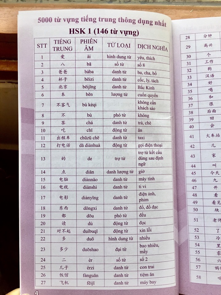 Mua tại Tiktok- 5000 từ vựng tiếng Trung thông dụng nhất Nội dung sách: “Sách – 5000 từ vựng tiếng Trung thông dụng nhất” theo khung đề thi từ HSK1 – 6 cung cấp đầy đủ lượng từ vựng cần thiết giúp việc học từ vựng tiện lợi và hiệu quả hơn, đồng thời hỗ trợ cho việc thi các cấp độ HSK từ 1 đến 6 Tác giả: Trần Thị Tú Oanh, Diệu Hồ Số trang: 184 Năm xuất bản: 2019 Nhà xuất bản: Đà Nẵng Chú ý : Nội dung trong sách tổng 5000 từ HSK1 (146 trang 4) HSK2(149 Trang 9) HSK3(303 từ trang 14) HSK4(606 từ trang 24) HSK5 (1296 từ trang 45) HSK6(2500 từ trang 88) Nhằm đáp ứng nhu cầu học từ vựng của bạn đọc, chúng tôi xin giới thiệu cuốn sách 5000 từ vựng tiếng Trung – Bí kíp chinh phục từ vựng kỳ thi HSK 1 – 6 tổng hợp những từ vựng tếng Trung được sử dụng với tần suất nhiều nhất trong các kỳ thi HSK. Ngoài việc liệt kê những từ vựng thông dụng, chúng tôi còn đưa ra cách phát âm, âm Hán Việt, nghĩa để các bạn có thể hiểu rõ và sử dụng đúng từ vựng vừa học, từ đó giúp các bạn nâng cao vốn từ vựng và nâng cao khả năng tiếng Trung, đặc biệt là đạt kết quả tốt trong các kỳ thi HSK. Để có thể thi được HSK, bạn phải có 1 vốn từ vựng phù hợp. HSK càng cao thì lượng từ vựng cũng càng yêu cầu mở rộng hơn. Cụ thể: Hán ngữ 1: học hết lượng từ vựng trong giáo trình hán ngữ 1 (150 từ). Hán ngữ 2: học hết lượng từ vựng trong giáo trình hán ngữ 1+2 (300 từ). Hán ngữ 3: học hết lượng từ vựng trong giáo trình hán ngữ 1+2+3 (600 từ). Hán ngữ 4: học hết lượng từ vựng trong giáo trình hán ngữ 1+2+3+4 (1200 từ). Hán ngữ 5: học hết lượng từ vựng trong giáo trình hán ngữ 1+2+3+4+5 (2500 từ). Hán ngữ 6: học hết lượng từ vựng trong giáo trình hán ngữ 1+2+3+4+5+6 (5000 từ).