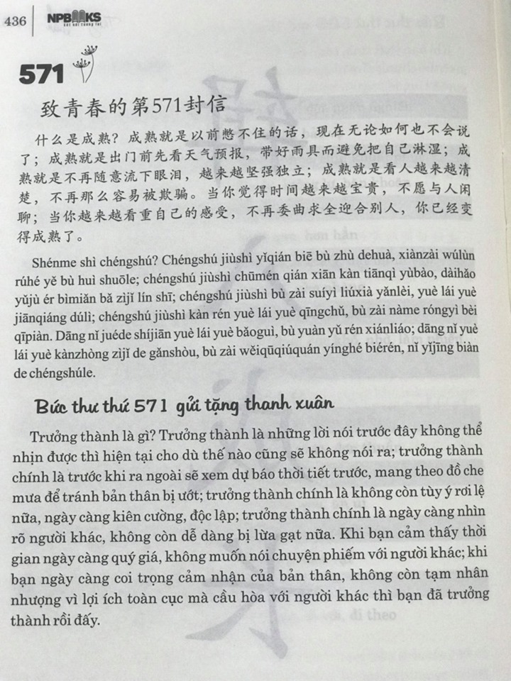 1.999 Bức Thư Viết Cho Chính Bạn (Song Ngữ Trung Việt Có Phiên Âm) - (Bản dịch chuẩn và đầy đủ) Tác giả: Nhật Phạm Số trang: 509 Năm phát hành: 2019 Công ty