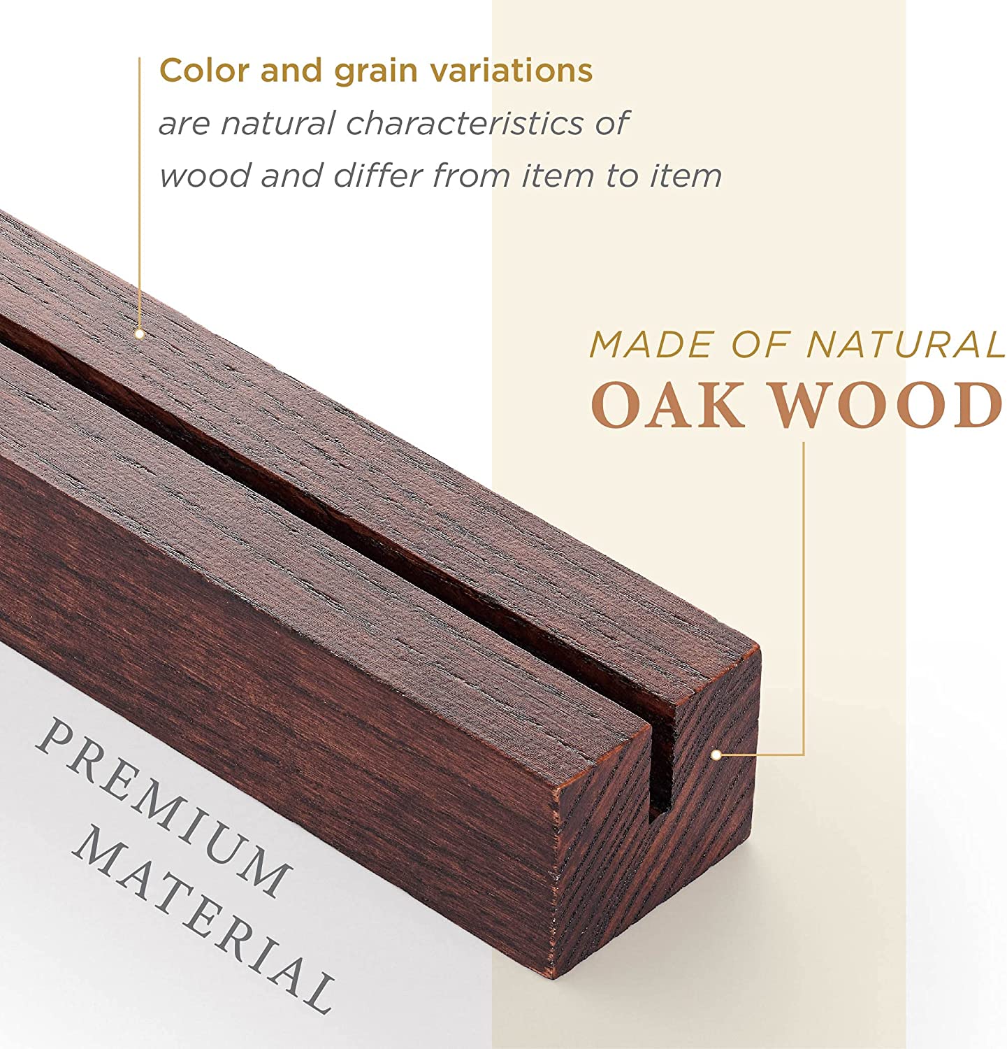 Đế được làm bằng gỗ sồi tự nhiên, bề mặt gỗ đánh bóng sáng, không có những gai gỗ nhỏ, an toàn và đẹp mắt khi sử dụng. Được cắt từ gỗ nguyên tấm nên các biến thể về màu sắc và thớ gỗ là khác nhau giữa các mặt hàng. Mỗi ngăn có độ dày 3,5 mm / 0,13 ” tạo sự vừa vặn và hoàn hảo cho bảng hiệu, ảnh, menu hoặc thẻ của bạn. Đế gỗ để ảnh Toploader, thẻ, lịch bàn, menu hoặc kệ trưng bày ảnh. Là sản phẩm hoàn hảo cho quán cà phê, nhà hàng, tiệc cưới, cửa hàng decor, tiệm bánh, tiệc tự chọn, phòng tắm cô dâu hoặc bất kỳ trang trí sự kiện kỷ niệm nào. Thiết kế để không gây trở ngại cho không gian bàn và kiểu dáng hấp dẫn của đế gỗ có thể phù hợp với bất kỳ phong cách trang trí nào. Sản phẩm được đóng gói kĩ càng, bên trong phủ nhiều lớp PE, giấy để tránh bất kỳ vết xước nào trong quá trình vận chuyển.   Bộ sản phẩm gồm 20 đế gỗ, kích thước mỗi đế: 12 x 3 x 2,6 cm Lưu ý: Sản phẩm không bao gồm card và lịch như hình minh hoạ.