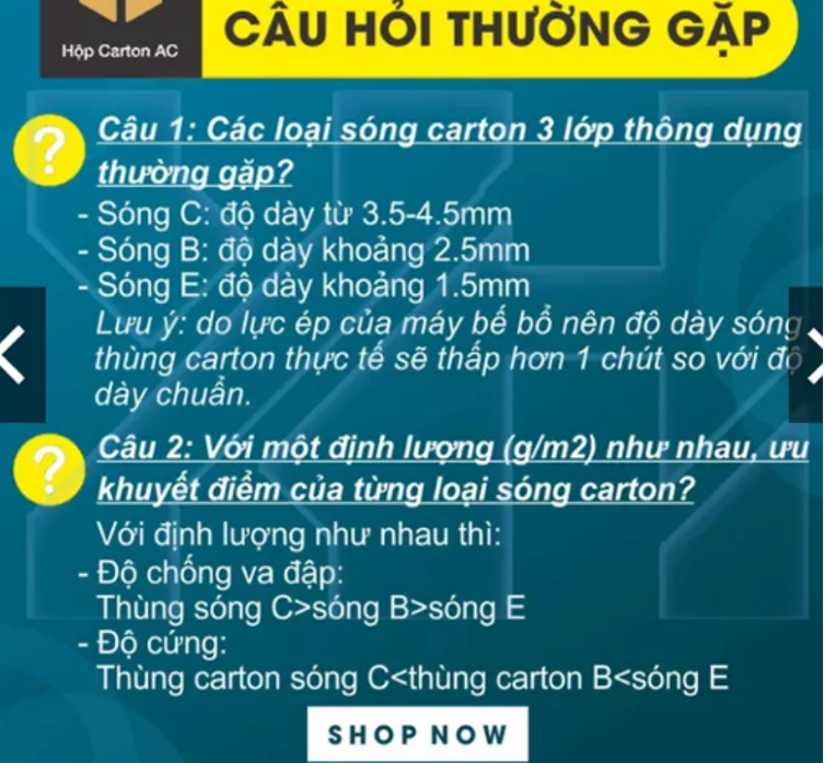 "Định lượng: ~280 - 450 gsm Tháng sản xuất: < 3 tháng Thông số kỹ thuật: Kích thước: 16x12x6 cm (kích thước phủ bì) Màu sắc: nâu nhạt Carton 3 lớp sóng E/B, chịu lực