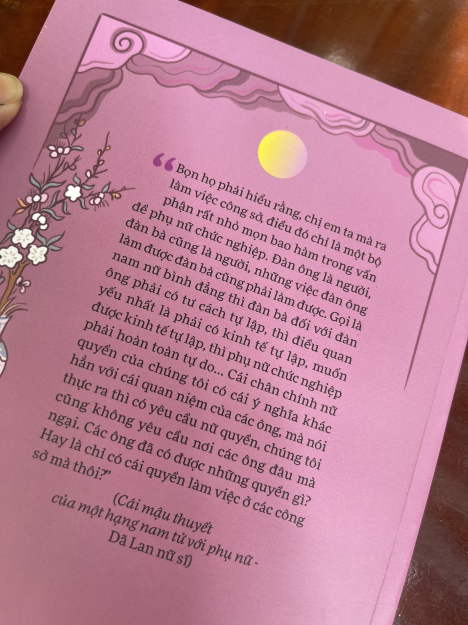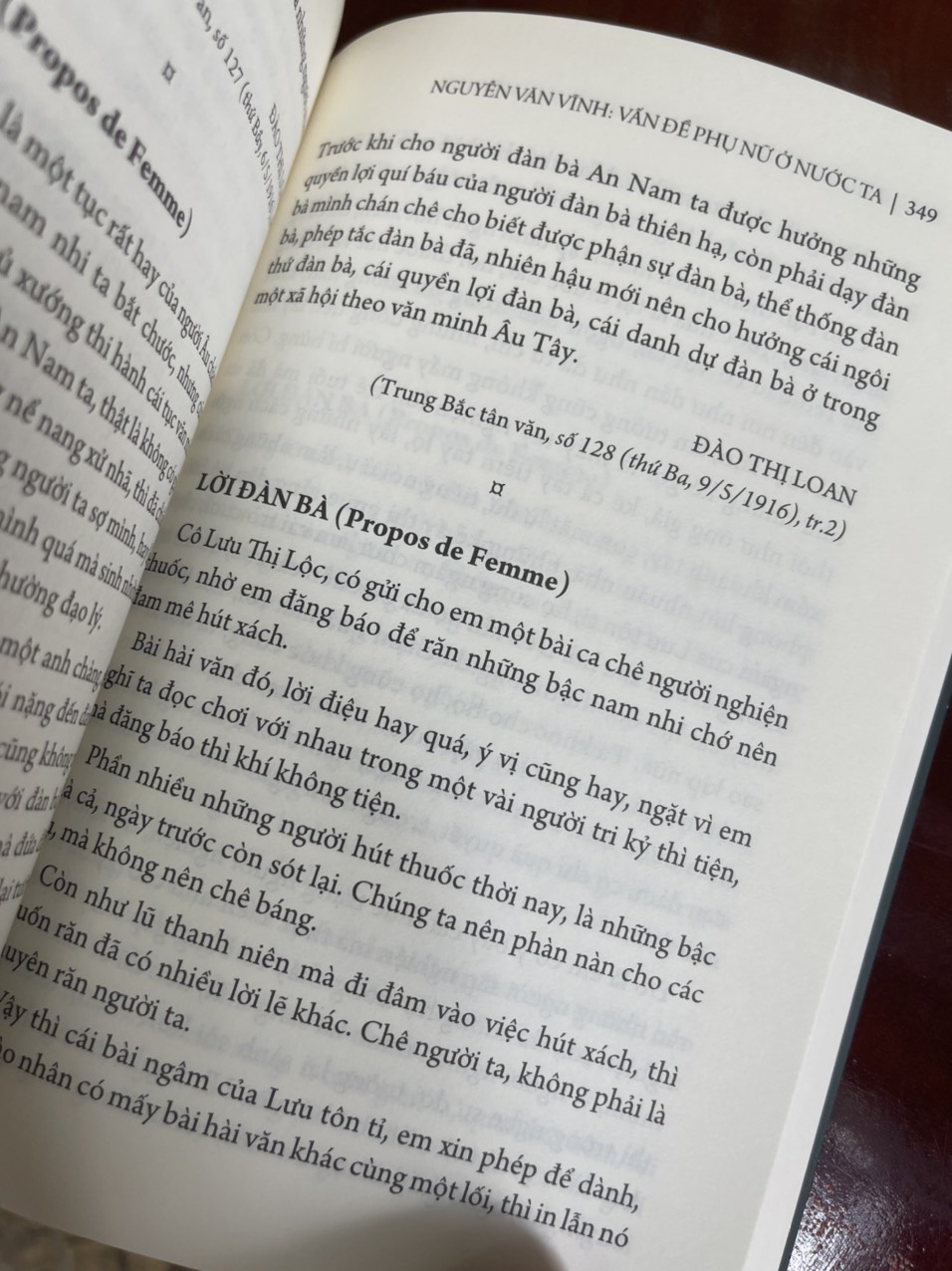 Nhà xuất bản Phụ Nữ đã kiên trì trong vòng 10 năm qua gây dựng tủ sách PHỤ NỮ TÙNG THƯ với tinh thần khôi phục và tái công bố các tư liệu đấu tranh cho nữ quyền tại Việt Nam hồi đầu thế kỷ 20. Lần lượt ta đã có thêm tư liệu từ Phan Bội Châu, Phan Khôi, in lại sách quý “Nam Nữ Bình Quyền” nhờ dự án này. Hôm nay ta có thêm 02 tập sách thuộc bộ này: công bố tác phẩm đăng báo của Nguyễn Văn Vĩnh và các bài đăng tại Huế về vấn đề nữ quyền trước 1945.