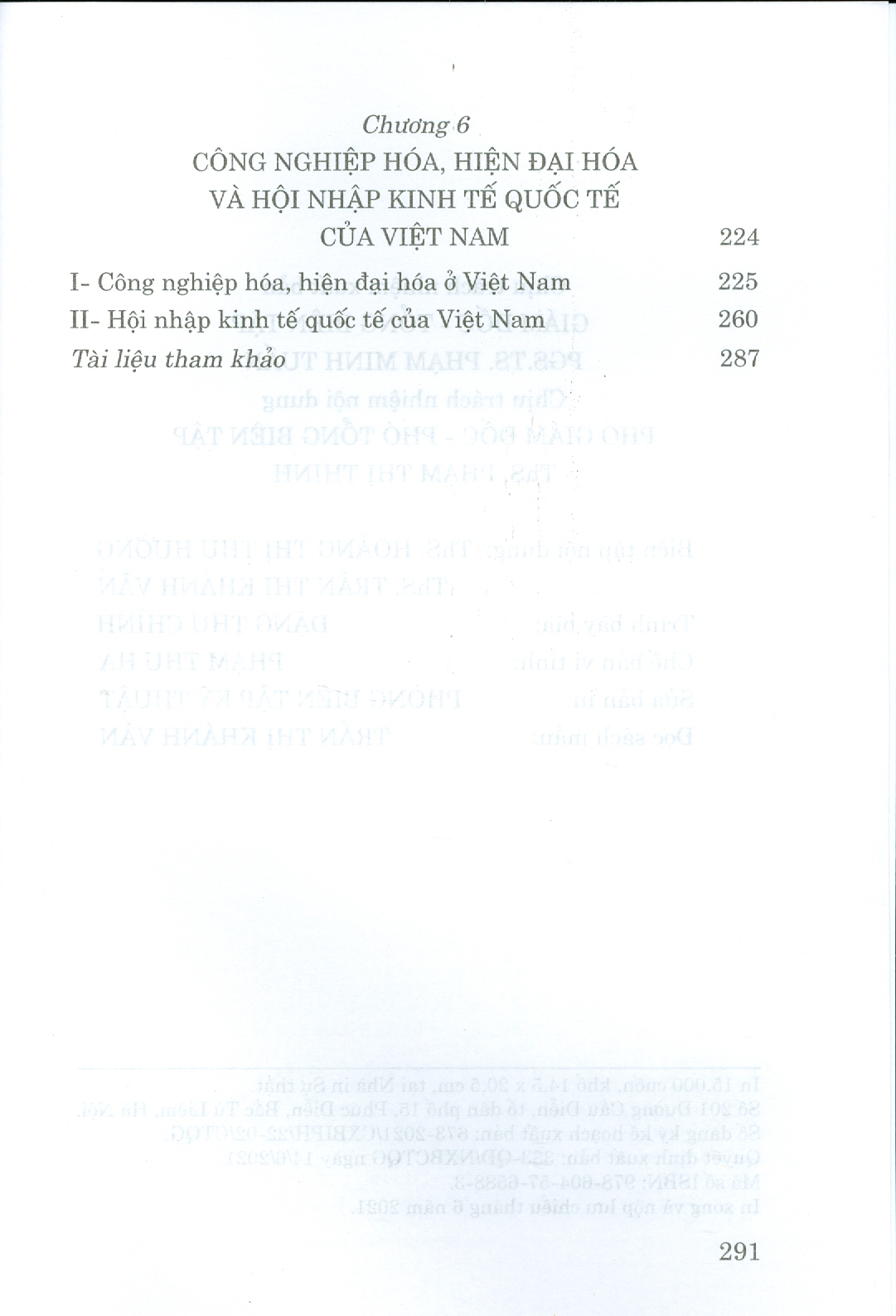 Chương 6 cung cấp hệ thống tri thức về công nghiệp hóa, hiện đại hóa ở Việt Nam trong bối cảnh thích ứng với cuộc Cách mạng công nghiệp lần thứ tư; trong đó đề cập những nội dung cơ bản như: khái quát lịch sử các cuộc cách mạng công nghiệp; khái quát về công nghiệp hóa và các mô hình công nghiệp hóa tiêu biểu; tính tất yếu và nội dung cơ bản của công nghiệp hóa, hiện đại hóa ở Việt Nam. Đặc biệt, Chương 6 nhấn mạnh đến những quan điểm và giải pháp thực hiện công nghiệp hóa, hiện đại hóa ở Việt Nam trong bối cảnh cuộc Cách mạng công nghiệp lần thứ tư.