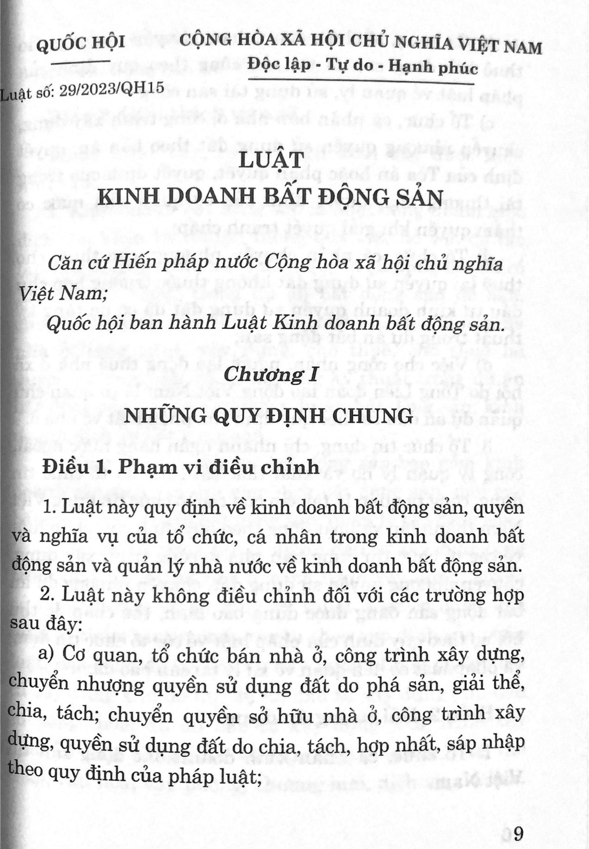 Ngày 28/11/2023 tại Kỳ họp thứ 6, Quốc hội khóa XV thông qua Luật Kinh doanh bất động sản 2023 gồm 10 Chương, 83 Điều. Luật chính thức có hiệu lực thi hành từ
