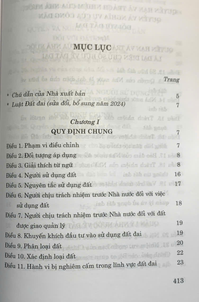 Nhằm giúp bạn đọc trong việc tìm hiểu và thực thi pháp luật về đất đai, Nhà xuất bản Chính trị quốc gia Sự thật xuất bản cuốn sách Luật Đất đai (sửa đổi, bổ sung năm 2024). Cuốn sách là văn bản hợp nhất từ Luật Đất đai năm 2024 và Luật sửa đổi, bổ sung một số điều của Luật Đất đai số 31/2024/QH15, Luật Nhà ở số 27/2023/QH15, Luật Kinh doanh bất động sản số 29/2023/QH15 và Luật Các tổ chức tín dụng số 32/2024/QH15 năm 2024 (những nội dung sửa đổi, bổ sung Luật Đất đai năm 2024).