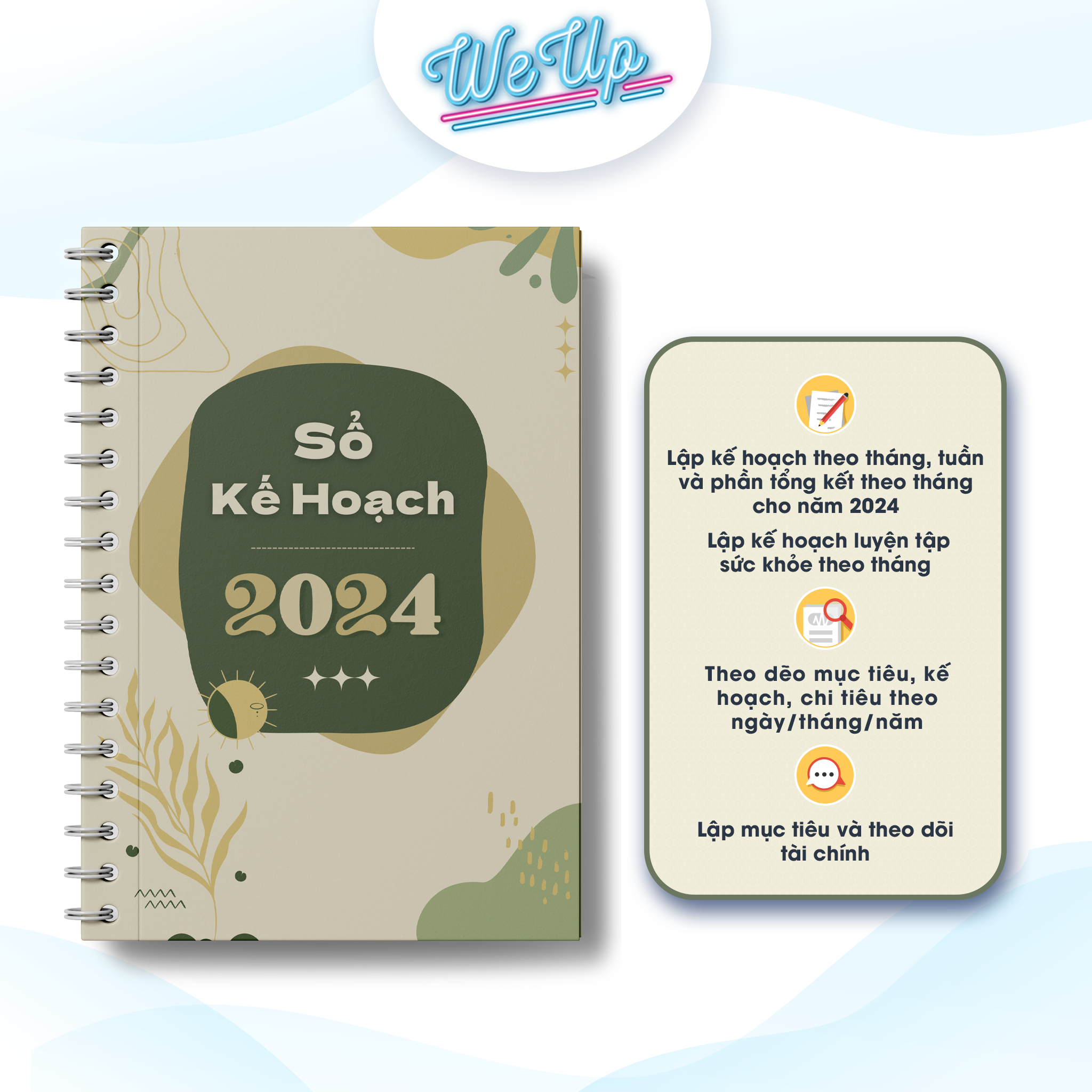 Sổ kế hoạch 2024: Sổ có 200 trang. Bao gồm các nội dung: + Tổng kết năm 2023 + Lập kế hoạch theo tháng, tuần và phần tổng kết theo tháng cho năm 2024 +