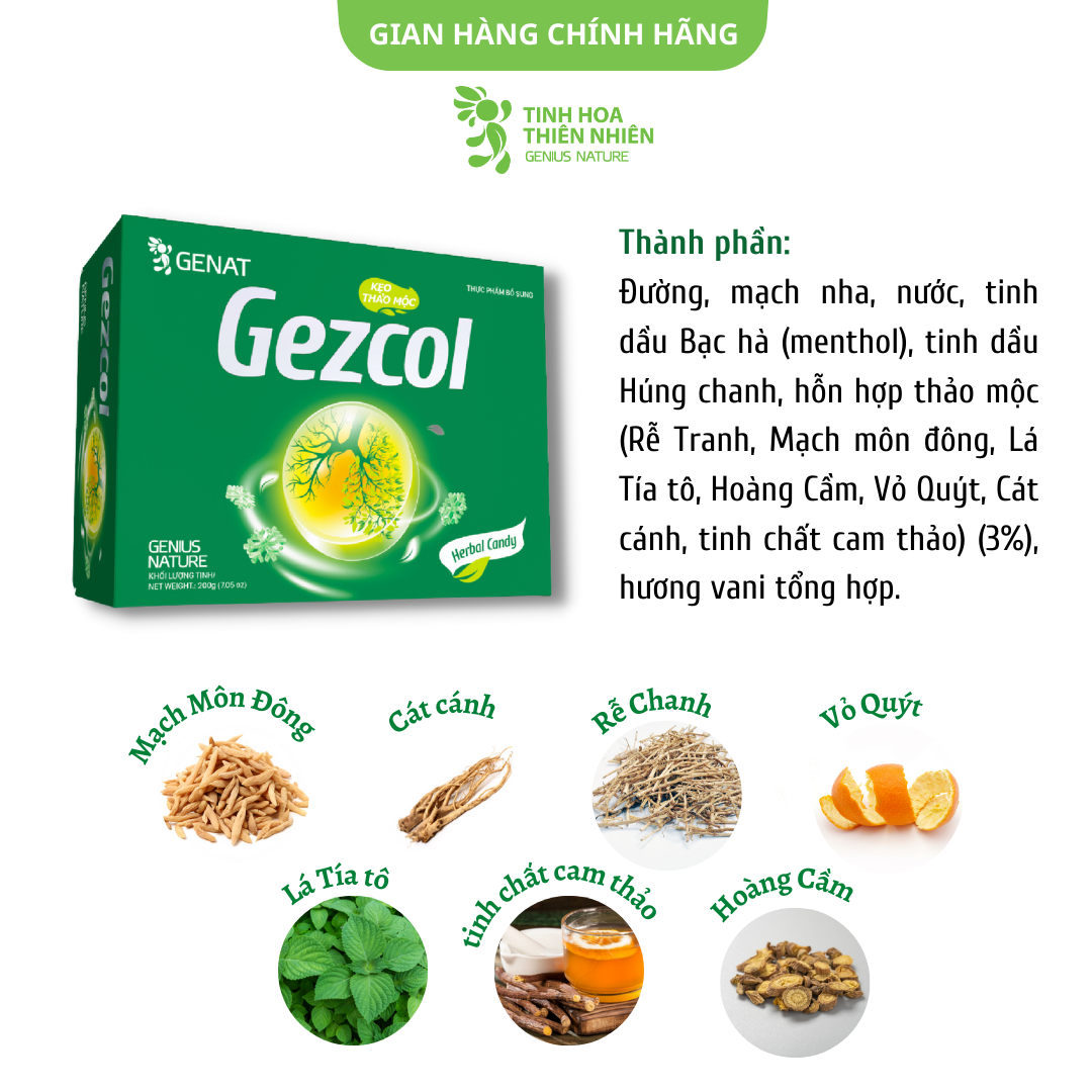 - Thực phẩm bổ sung kẹo thảo mộc Gezcol Thành phần: Đường, mạch nha, nước, tinh dầu Bạc hà (menthol), tinh dầu Húng chanh, hỗn hợp thảo mộc (Rễ Tranh, Mạch môn đông, Lá Tía tô, Hoàng Cầm, Vỏ Quýt, Cát cánh, tinh chất cam thảo) (3%), hương vani tổng hợp. Hướng dẫn sử dụng: Mở bao bì dùng liền, mỗi lần ngậm 1 viên. Bảo quản: Nơi khô ráo, sạch sẽ, tránh làm rách bao bì. Lưu ý: Không sử dụng khi sản phẩm có hiện tượng chảy nước. Hạn sử dụng: 24 tháng kể từ ngày sản xuất. Ngày sản xuất và hạn sử dụng được in trên bao bì.