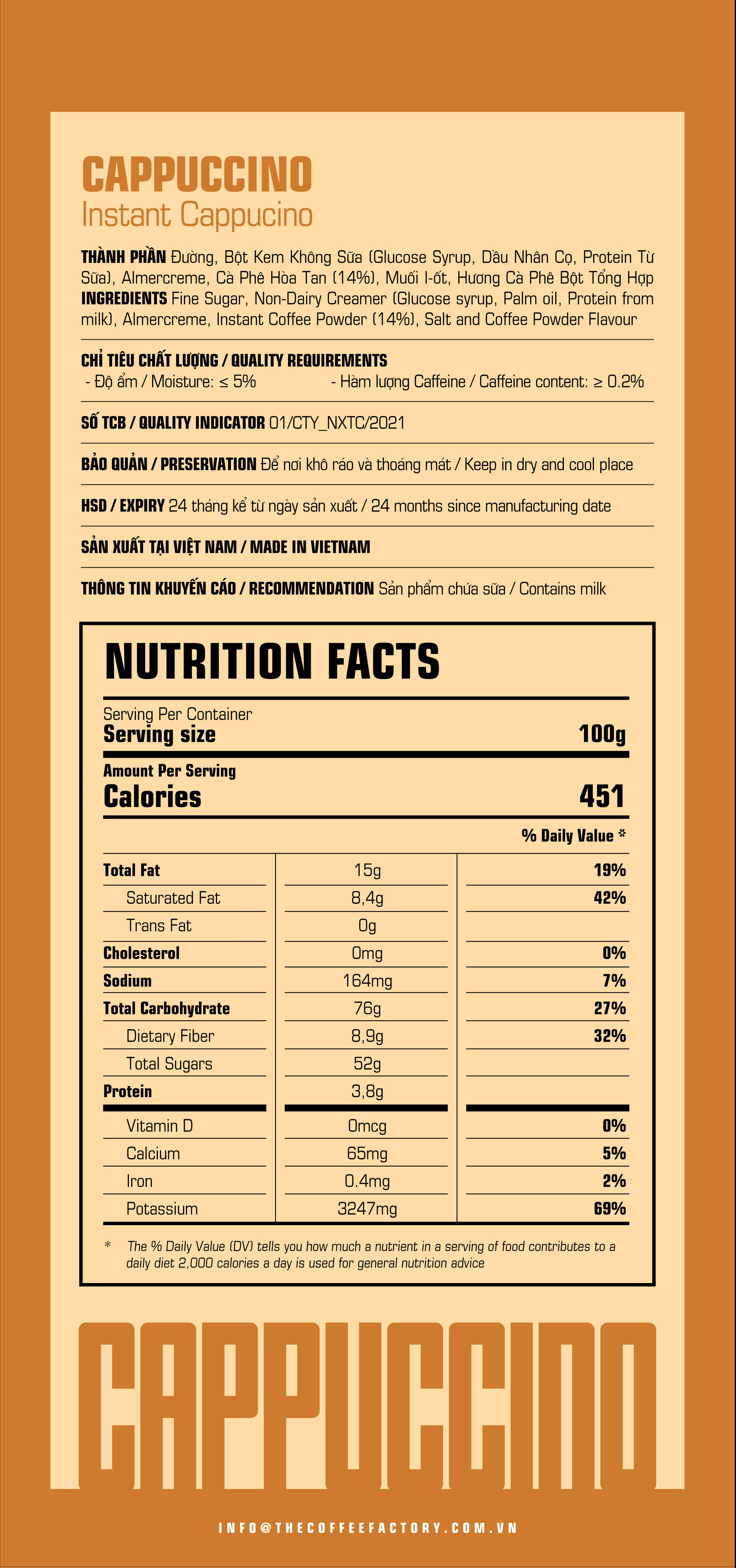 THÔNG TIN SẢN PHẨM Một ly CAPPUCCINO Hazelnut thơm ngon hài hòa như được pha bằng máy tại quán cà phê bạn yêu thích với hương vị hạt dẻ độc đáo. Đặc biệt, CÀ PHÊ