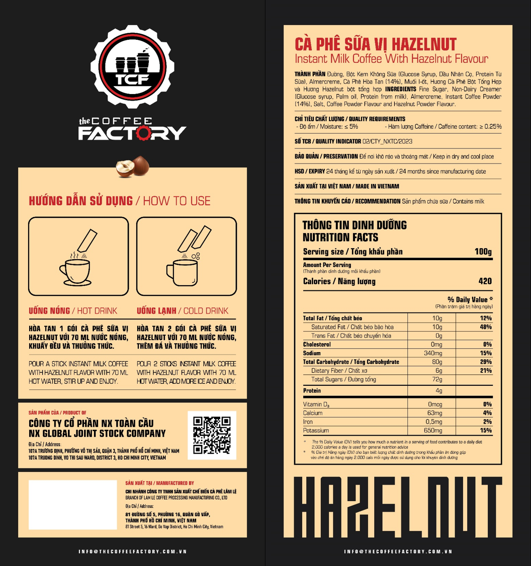Tên sản phẩm: Cà phê sữa vị hazelnut hòa tan The Coffee Factory (Hộp 15 gói x 16g)